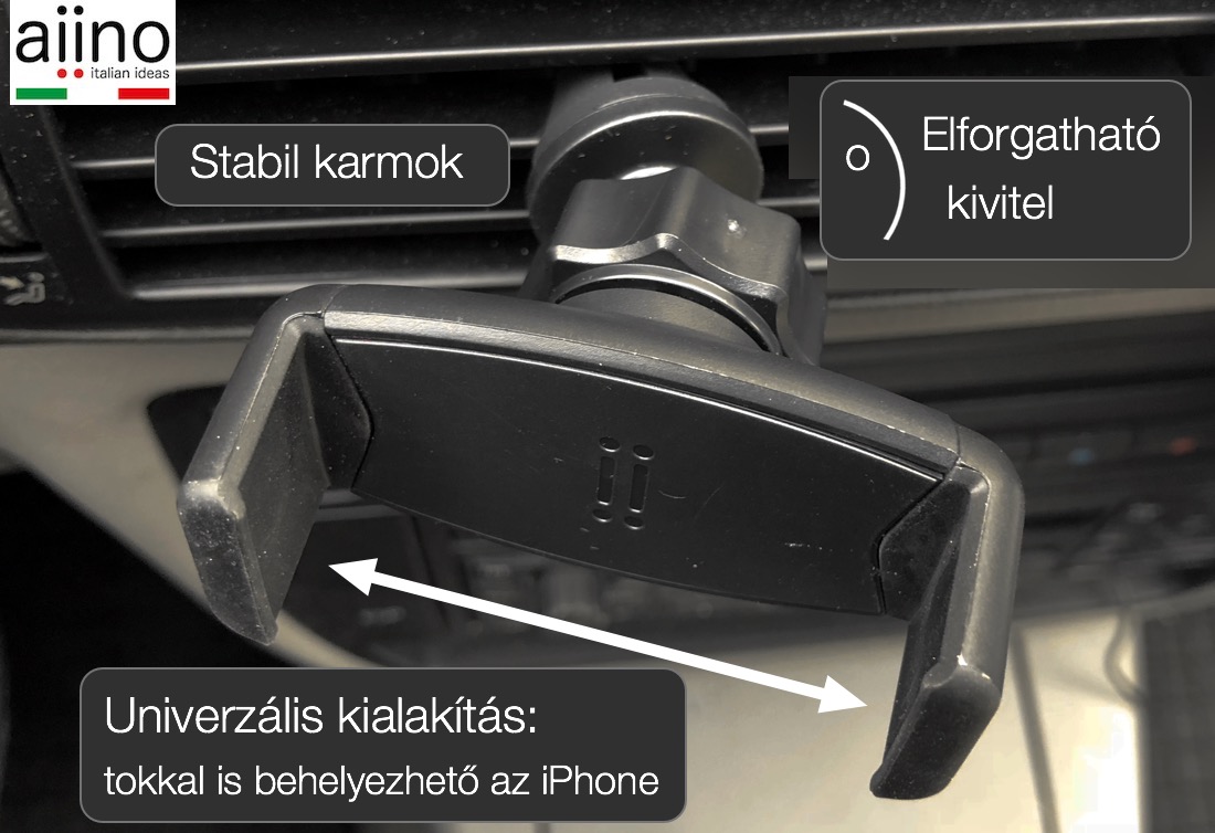 Az AIINO Easy Car Holder rögzítő megoldása nem csak rácsra helyezhető, hanem bármilyen vékonyabb vízszintes, függőleges, átlós vagy körkörös szellőzőrácsra. A használat közben minden csatlakozófelületet és gombot szabadon hagy, így az iPhone a használat közben tölthető és teljes értékűen használható a vezetésbiztonság szabályait betartva.