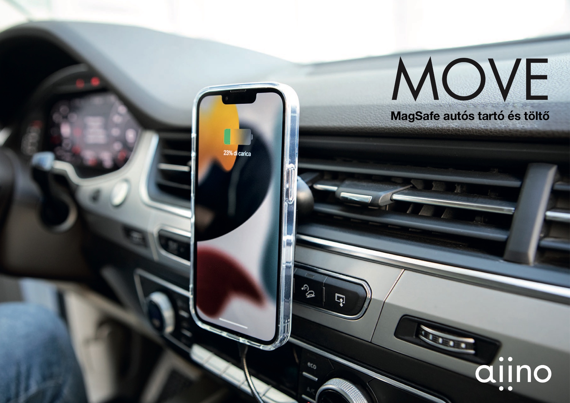 Ezeket a hagyományokat folytatja a cég korszerű, MagSafe töltést is biztosító, szintén hűtőrácsra illeszthető terméke, a rendkívül kis méretű, visszafogott megjelenésű, nagy stabilitású AIINO Move MagSafe autós tartó és töltő, amely nem oldalsó szorítóval, hanem az iPhone 12 szériától elérhető mágneses módon rögzíti a készülékeket. USB-C bemenete révén pedig tölteni is képes vezeték nélkül az iPhone modelleket egy meglévő USB-A töltőkapuról vagy külön beszerzett autós töltőről - például az AIINO kínálatából.