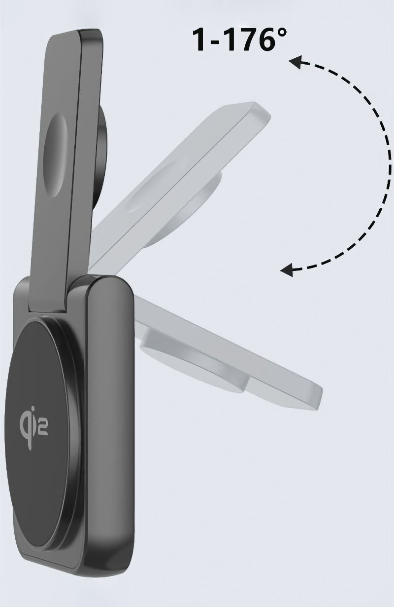 Az LMP Twist 2-in-1 Qi2 töltő többféleképpen használható: lehetőség van állványként hajtogatni, amikor is megtartja az iPhone készüléket a kijelzőt jól látható dőlésszögben tartva, de mód van teljesen kihajtani is, amikor egymás mellett fekszik az iPhone és az Apple Watch. A gyakorlatban 1° és 176° között tudjuk kihajtani a terméket - vagyis teljesen laposra nem, de 4° híján majdnem síkra.