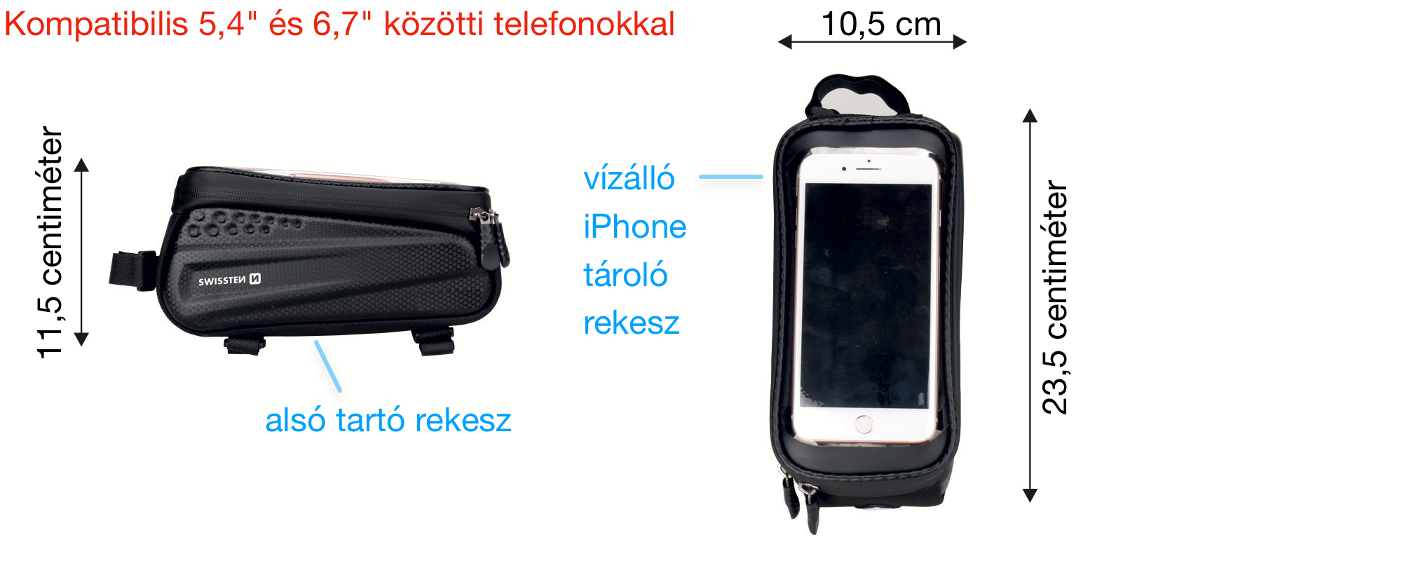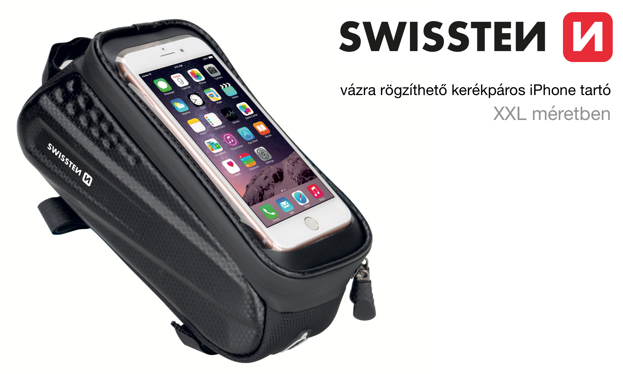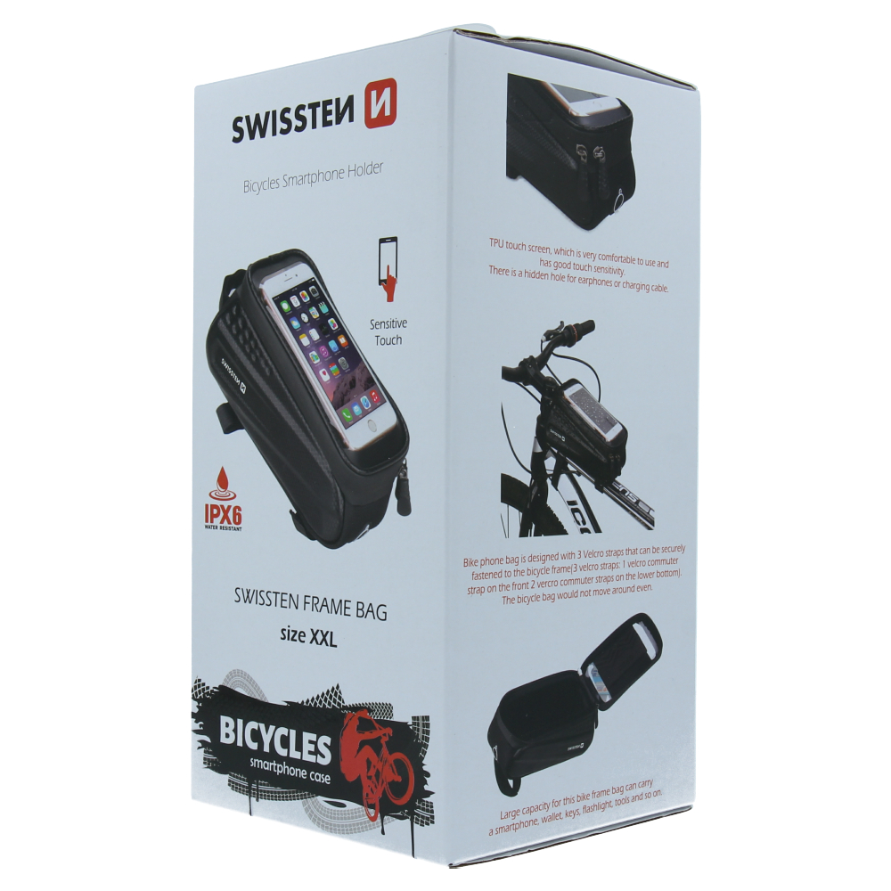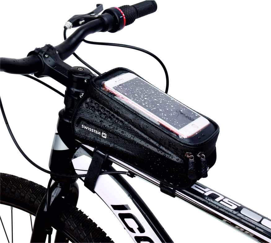 A SwissTen vázra rögzíthető kerékpáros táska akár biciklire, akár elektromos rollerre is rögzíthető a váz valamely pontjára, praktikusan az elejére, hiszen ott látjuk a telefont. iPhone tároló része 5,4 hüvelykes készülékektől a 6,7 hüvelykes modellekig bármely telefont be tudja fogadni, vagyis univerzálisnak nevezhetjük. Ez a rekesz vízálló, fedi a készüléket, ugyanakkor elérhetővé teszi az érintésérzékenységet, miközben láthatóvá teszi a kijelzőt és védi az iPhone-t a felcsapodó szennyeződésektől és az esővíztől is.