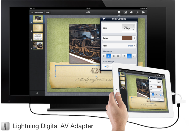 A Lightning csatlakozós iPad, iPhone és iPod touch készülékek alkalmasak arra, hogy nagy képernyős televízión megjelenítsék egyes alkalmazások tartalmát, mint fényképbemutatók, Keynote prezentációk, mozgóképek, illetve az iPad és iPhone modellek akár a kijelző teljes tükrözésére is képesek, így egy az egyben azt jelenítjük meg a televízión, ami az eszköz kijelzőjén látható. E célra az Apple egy praktikus adaptert kínál, amely révén a Lightning kapun HDMI jelet tudunk kiküldeni televízióra, projektorra, házimozi erősítőre.