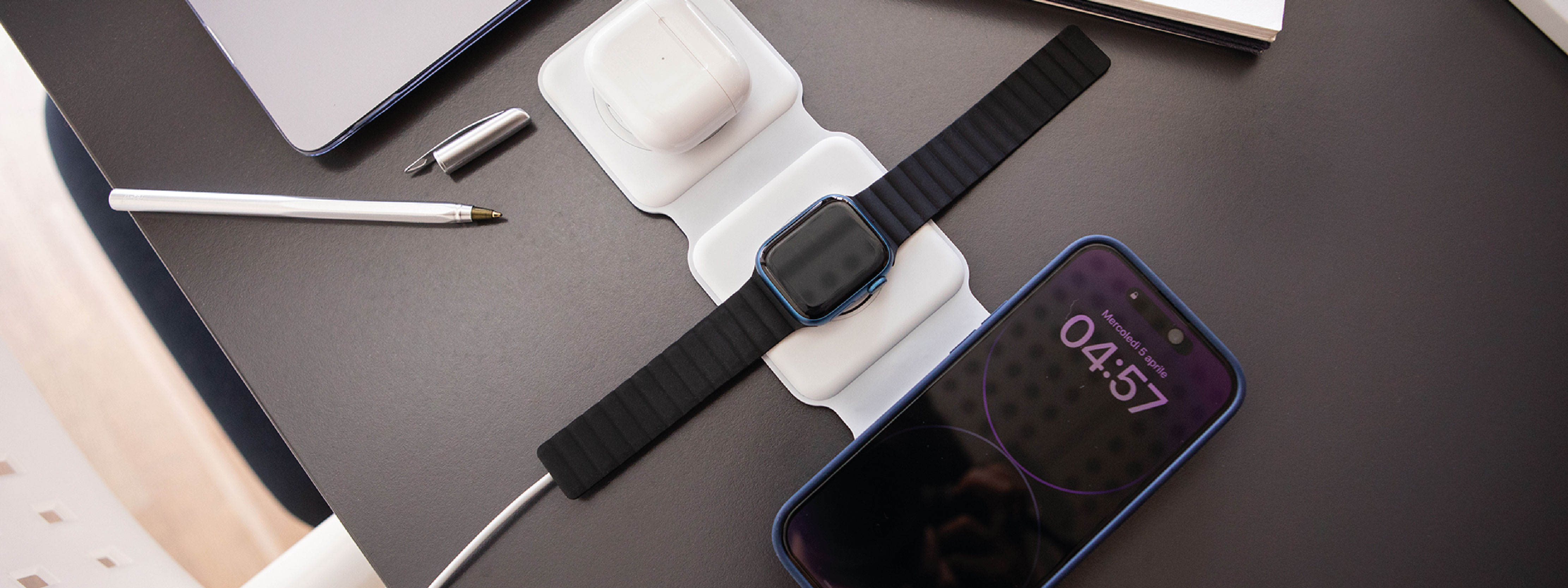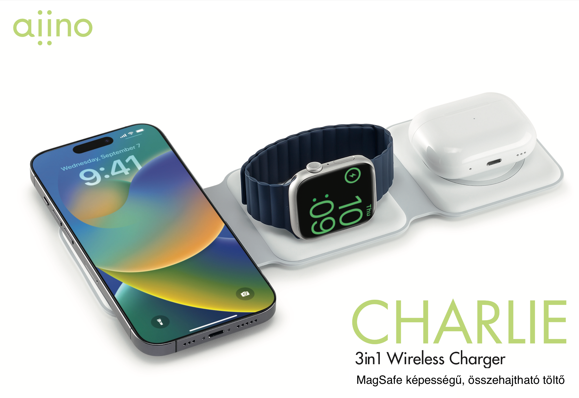 Az AIINO Charlie összehajtható kivitele révén helytakarékosan is elhelyezhető, és megtartja a mágnesesen rögzülő készülékeket a felületén. Az Apple Watch tartó/töltő kihajtható, így ha olyan szíjunk van, amely nem bontható ketté, akkor is lehetőségünk van a kényelmes töltésre, nem kell levennünk a szíjat az óráról erre az időre. A két MagSafe töltő széle mágnesesen kapcsolódik össze a hajtás során, így a töltő háromszöget képez. Ebben az esetben az egyik MagSafe töltő felület értelemszerűen nincsen használatban, hanem azon áll a termék. Ez praktikus olyankor, ha csökkenteni szeretnénk a helyigényt, és csak Apple Watch és iPhone töltésére használjuk az eszközt.