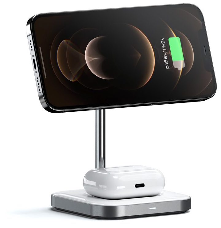 A Satechi Magnetic 2-in-1 Wireless Charging Stand egy mágneses asztali iPhone tartó, amely vezeték nélkül akár 7,5 Watt töltést biztosít az iPhone készüléknek, talpa pedig AirPods Pro töltővel van kiegészülve, amely vezeték nélkül képes feltölteni az AirPods Pro fülhallgató tokját, illetve az AirPods vezeték nélküli töltő tokkal szerelt változatát. Az AirPods töltő 5 Watt teljesítményű.