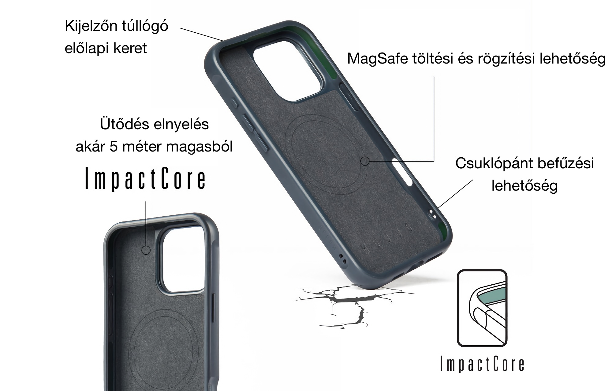 A Mujjo Shield Case alapja az ImpactCore™ nevű belső polikarbonát keret, amely a MIL-STD-810 amerikai katonai szabványnak megfelelő ütésállósági paraméternek felel meg. Ez azt jelenti, hogy akár öt méter magasságból leejtve is képes elnyelni az ütés erejét, és megvédeni a benne lévő telefon készüléket a sérüléstől, elhajlástól. (Természetesen a készülék előlapját és nyitott részeit más módon célszerű védeni, hiszen a tok a széleseket és a hátlapot védi, de az általa nem érintett részeket más módon védeni kell a behatások ellen.)