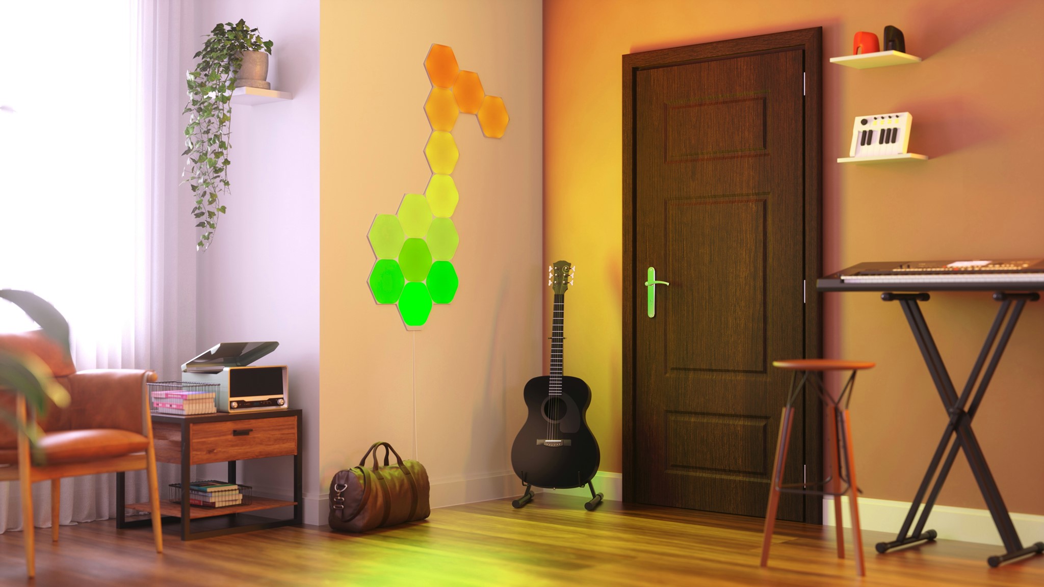 Az egység által kínált színsémák nem állandó azonos színű világítást jelentenek, hanem dinamikus változást: a Forest / Erdő nevű téma a zöld és fehér színek hullámzásával működik, mintha fák között lennénk egy erdőben. A Snowfall / Havazás téma a világoskék és a fehér színeket keveri. A Nemo nevű a bohóchal narancssárga és fehér árnyalatait vegyíti. Bármelyik opció nagyon látványos és kellemes hangulatú. Mi több, a hatszög alakú csempék érintés érzékeny felületűek, érintésre színt tudnak váltani, és ezáltal különleges használati élményt biztosítanak. Hasonlóan izgalmas a ritmus érzékelő modul, amely révén a zenére tud reagálni az egység, és ennek megfelelően a különböző lapok más-más színt vesznek fel, illetve a zene ütemére váltakoznak.