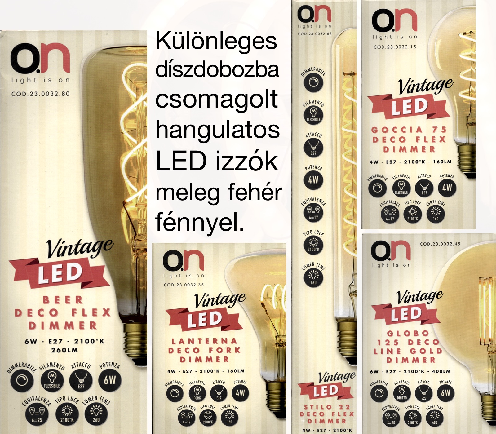 Az on hangulatos stílusú izzócsaládja alapvetően E27 foglalatba illeszthető, illetve néhány példány E14 csavarozású. A termékek páratlan megjelenése jól mutat egy ultramodern környezetben is, akár egy iMac mögé elhelyezett fali fényforrásba illesztve is. Az izzók kimondottan hangulatvilágítási célt látnak el, ennek megfelelően fényerejük nem tolakodóan erős, árnyalatuk pedig a meleg tartományba hajlóan sárgás.