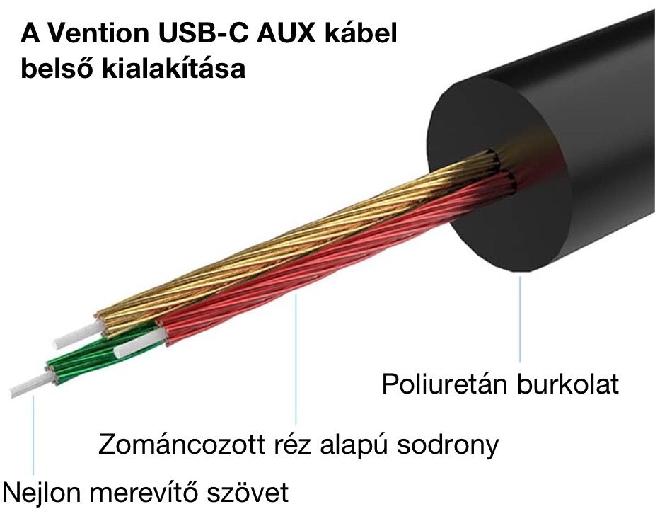A Vention USB-C AUX kábel végei a csatlakozások tökéletessége érdekében 24-karátos arany lapkákkal vannak bevonva. Az nemesfémek a legtökéletesebb és legtartósabb vezetők a hangtechnikai csatlakozók világában, ám az arany előnye például az ezüsttel szemben, hogy nem oxidálódik. Maga a csatlakozó külső része pedig alumínium bevonatú, így ellenáll a behatásoknak és a korróziónak egyaránt.