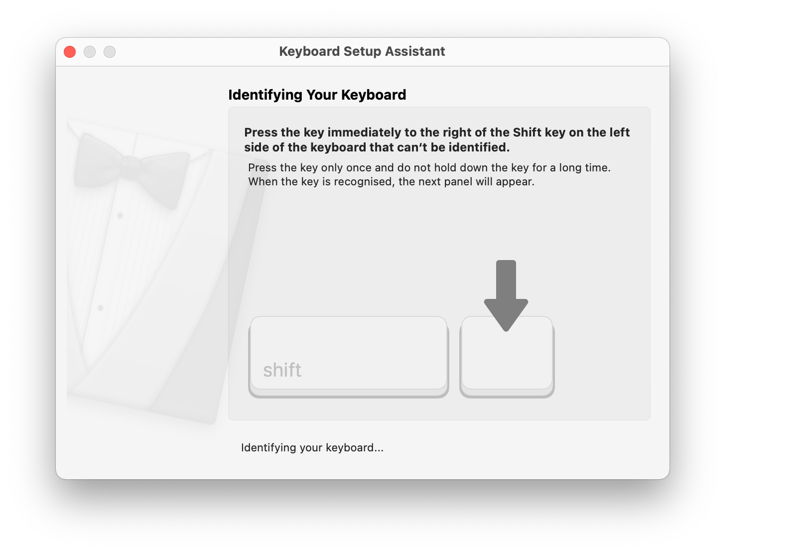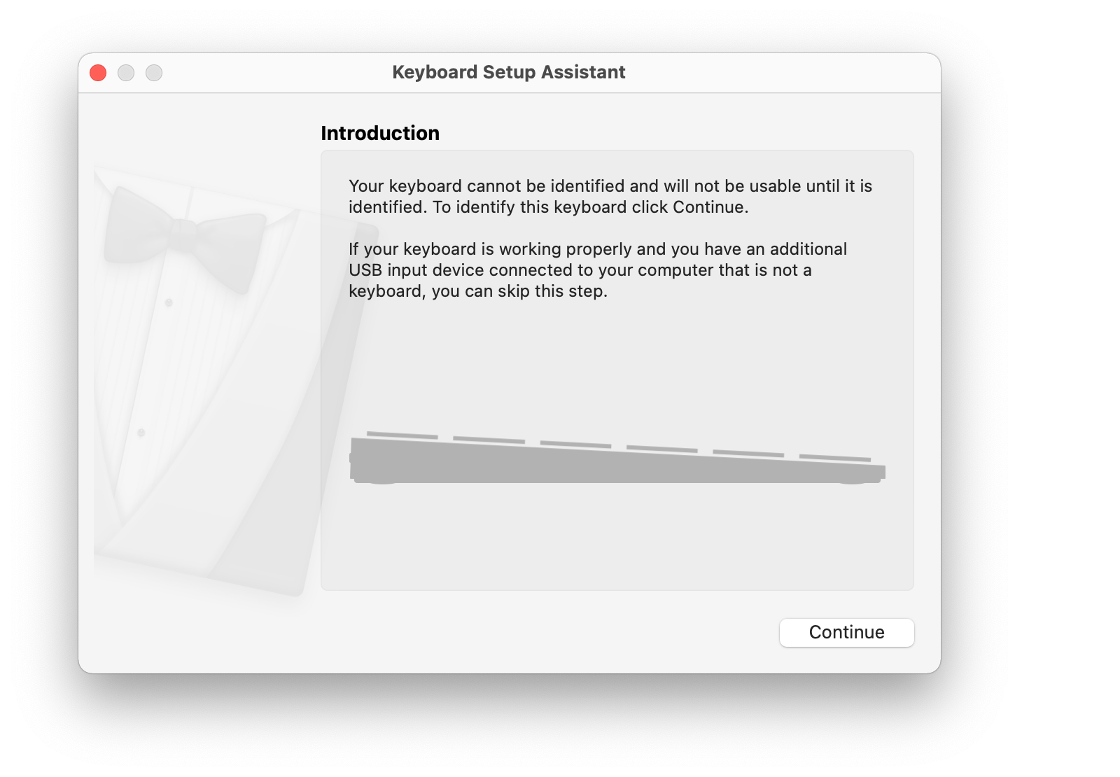 A macOS rendszer alapból általában nem ismeri fel a külső gyártók billentyűzeteinek kiosztását, így a következő párabeszédablak fogad: