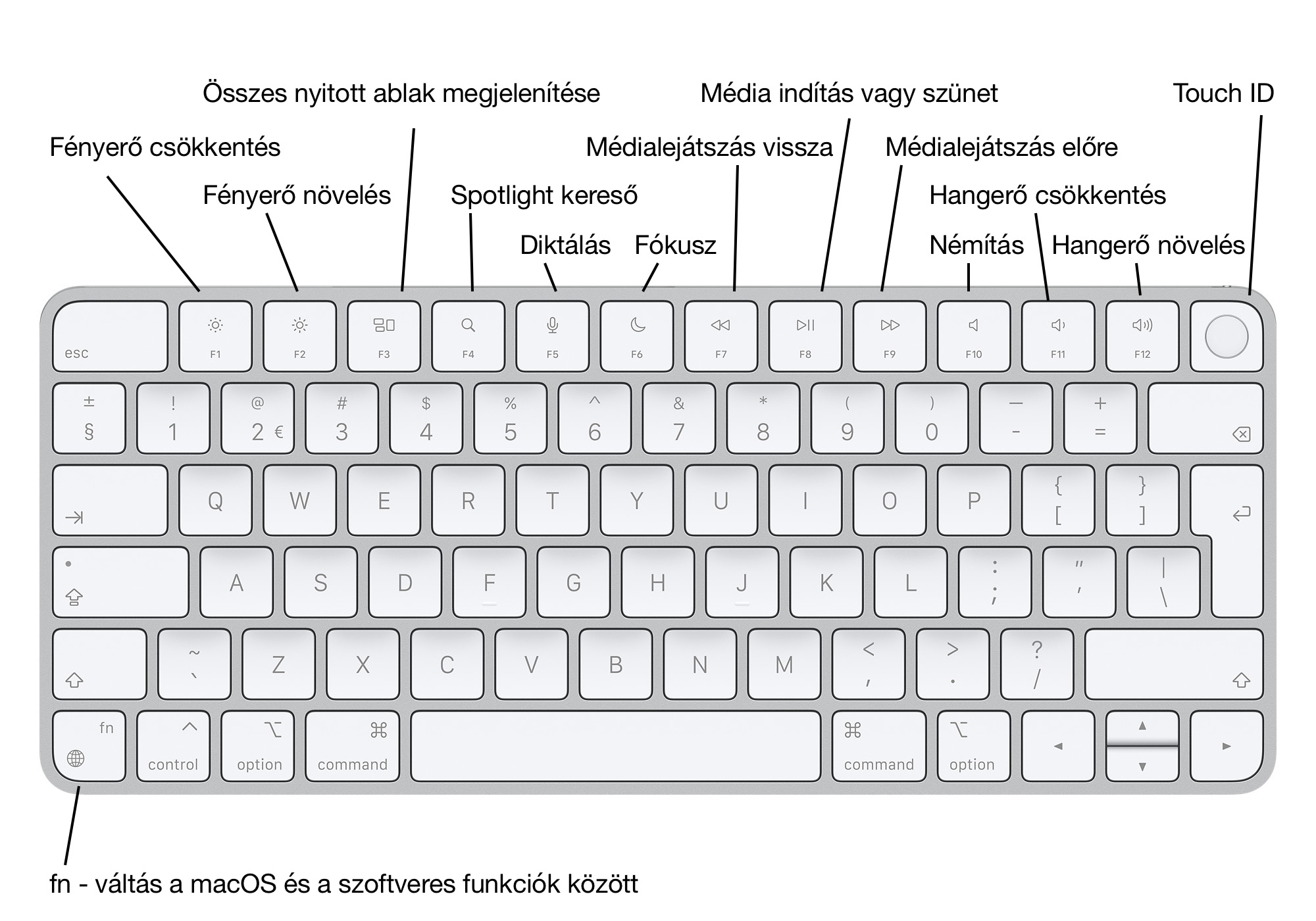 A billentyűzet felső részén lévő funkciógombok a fényerő csökkentését és növelését, az összes alkalmazás ablakának láthatóvá tételére szolgáló Exposé funkciót, a Spotlight kereső előhívását, a Siri előhívását, a Ne zavarjanak funkció bekapcsolását, média vezérlő funkciókat és hangerő szabályozó funkciókat érnek el alapértelmezés szerint. Ezeket a Command gombbal párosítva már feladatokra is használhatjuk.