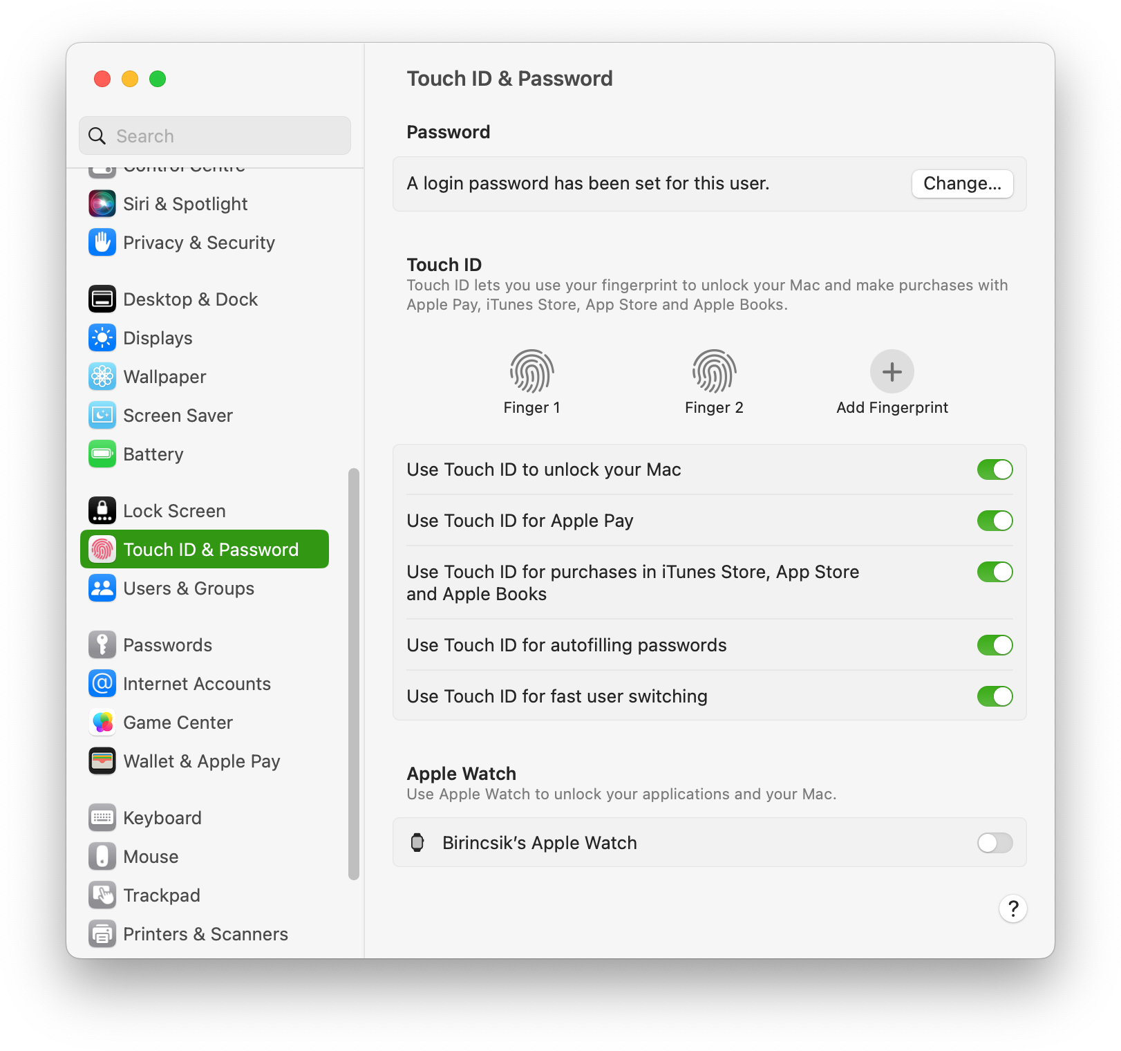 A Touch ID gomb a normál billentyűzet fölötti sorban, a funkciógombok szélén található. Ennek megtanítására a System Settings / Rendszerbeállítások program Touch ID felületén van lehetőség. Itt egyrészt meg tudjuk tanítani az ujjunk felismerését a gombban rejlő optikának, illetve ki tudjuk választani, hogy a Mac feloldása, az Apple Pay, az iTunes Store, App Store és Apple Books Store felületén engedélyezzük-e a hitelesítésünket az ujjlenyomatunkkal, valamint hogy bizonyos kontextusokban a jelszavunk helyett engedélyezzük az ujjlenyomatunk használatát. A Touch ID érzékelő használható a gyors felhasználóváltásra is, amennyiben a gépen több felhasználó van, és meg van tanítva az ujjlenyomatuk. A macOS alapból felajánlja az átlépést arra a felhasználói fiókra, amelyhez az adott ujjlenyomat tartozik, ha az ujjunkat az érzékelőn tartjuk néhány pillanatig.