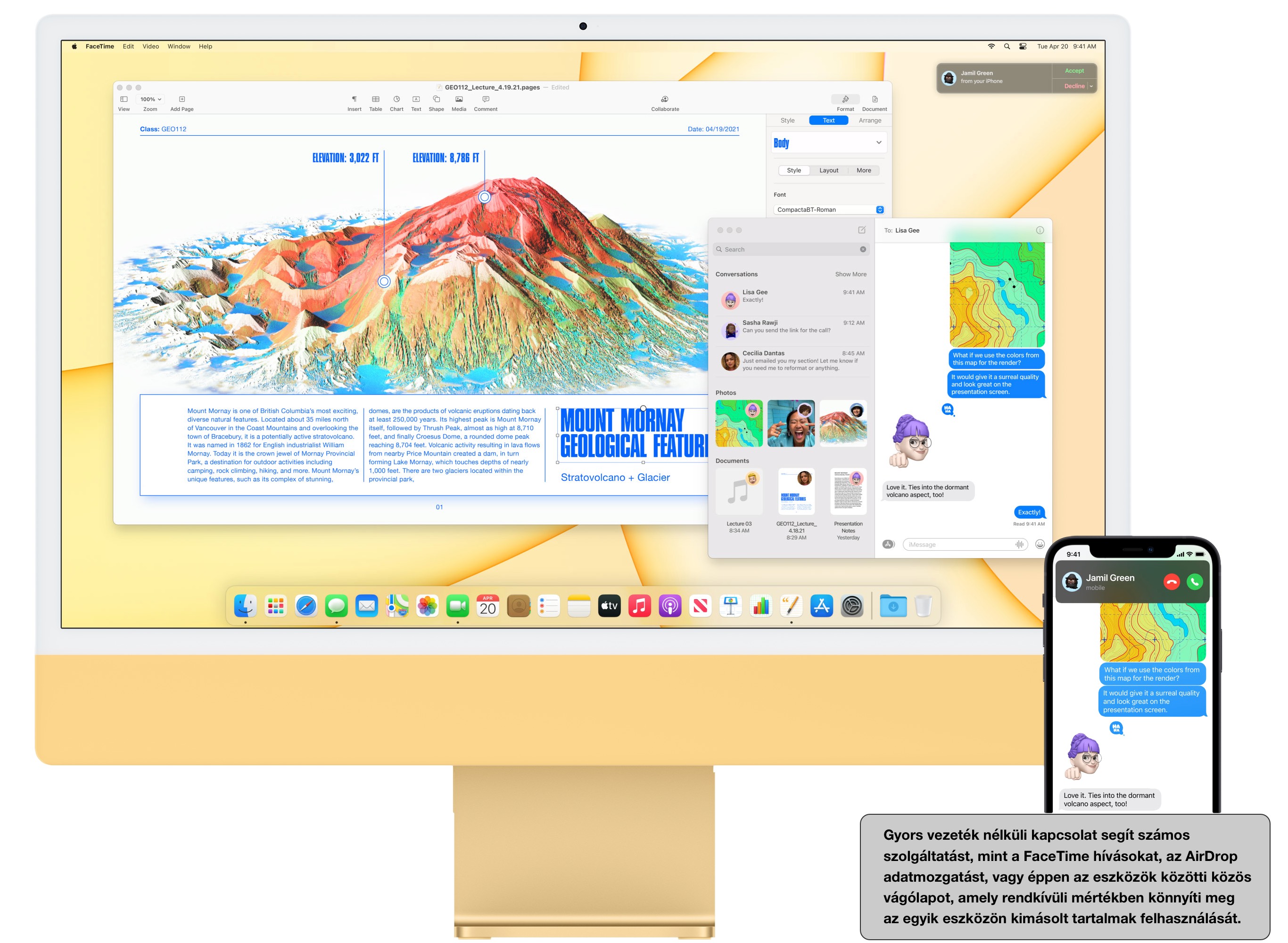 Az iMac 24” három mikrofonból álló rendszere egyrészt precízen érzékeli a hangunkat a térben, másrészt figyeli a háttérzajt, hogy azt halkítsa, így a beszélgető partner valóban a beszélő hangját hallja, és ne azt, ami a háttérben zajlik.