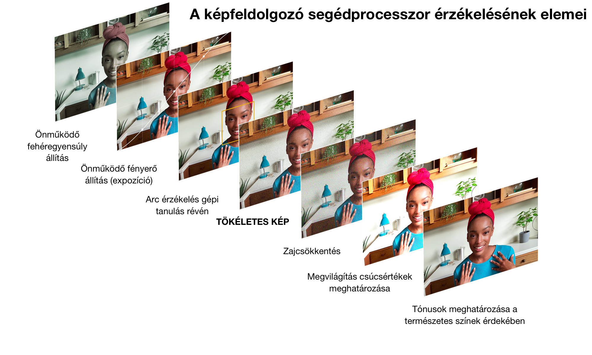 Ahogyan az iPhone készüléknél megszoktuk, a képfeldolgozó segédprocesszor számos dolgot mér, élőben állít, és a feldolgozott tartalomból lesz a fénykép vagy élő videó. A kamera a ténylegesen továbbított képkocka rátánál gyakoribb mintavételt vesz, hogy a képfeldolgozó segédprocesszor ebből feldolgozható képi információt kapjon: önműködően állítja a fehéregyensúlyt, a fényerőt, azonosítja a legfényesebb pontokat, elkerülve a kép részleteinek kiégését, felméri a tónusokat a megvilágításhoz képest, hogy a bőrünk színe valós legyen, felismeri a képen látható arcot vagy arcokat, csökkenti a kép úgynevezett zajosságát - azt a paramétert, amely miatt szemcsés a felvétel -, és mindeközben ennek a folyamatnak az optimumát jeleníti meg a képernyőn, illetve azt továbbítja a FaceTime, Zoom vagy más alkalmazásban. Az információk alapján pedig a gépi tanulás mesterséges intelligencia motorja, a Neural Engine tanul arról, hogy melyek a standard paraméterek és a változók, így a képfeldolgozás folyamatosan finomodik, javul.
