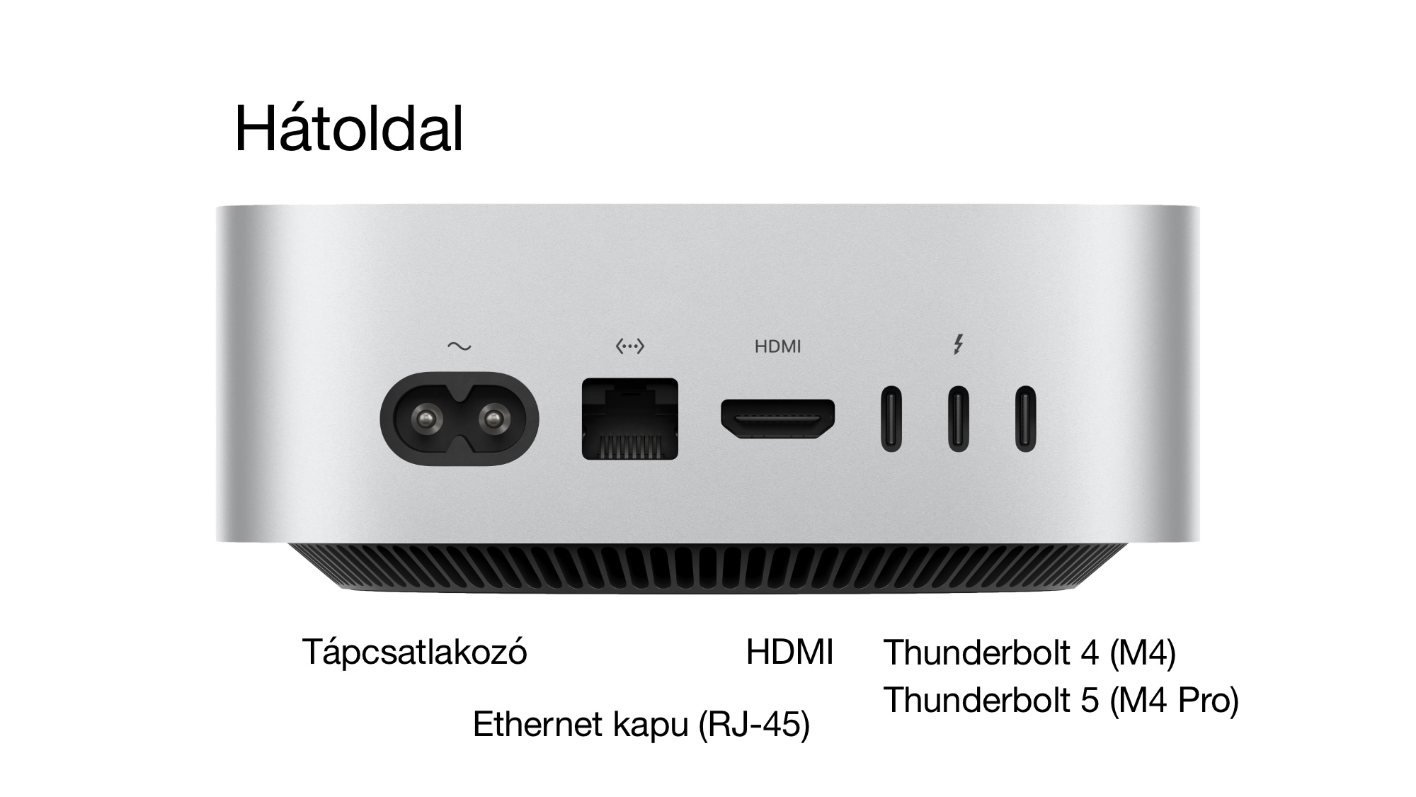 A bámulatos kis erőgép M4 változata három darab Thunderbolt 4 / USB4 kapuval rendelkezik a hátoldalon, amelyek mindegyike 40 Gb/s sebességre alkalmas (további két USB-C kapu található az előoldalon), az M4 Pro változat pedig három darab Thunderbolt 5 kapuval rendelkezik - ez a csatlakozó az Apple termékek között itt mutatkozott be először.