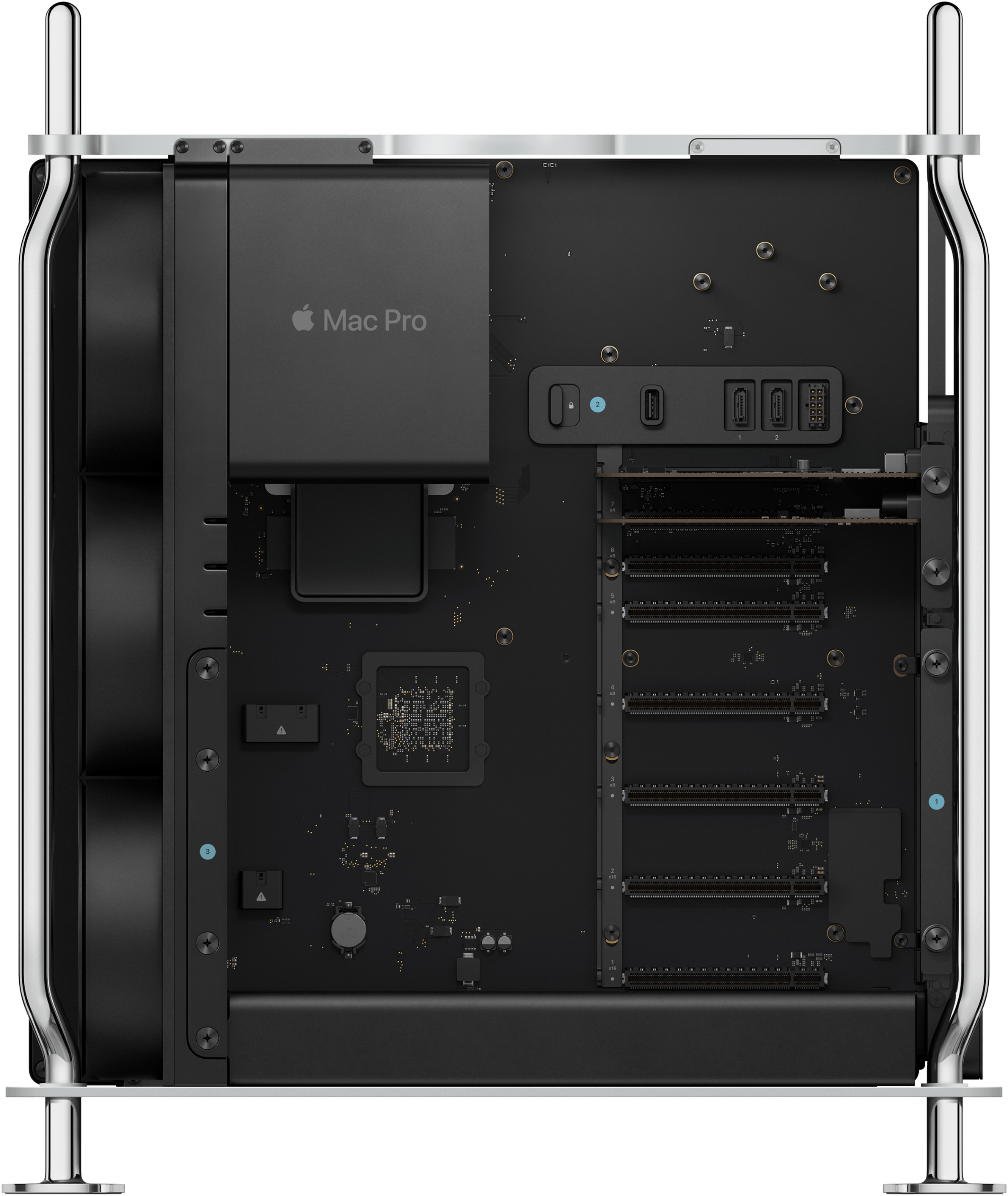 A Mac Pro hét darab PCI Express bővítőhelyet tartalmaz, és akár 300 Watt kiegészítő tápellátást képes biztosítani. A PCIe 4.0 szabvány támogatása révén a sávszélesség ezen kártyák számára duplázódott. A hét helyből egyet az Apple lefoglal - az USB-A és HDMI kapukat tartalmazó kártya a legfelső helyre be van építve, így a valóságban hat darab szabad helyünk van.