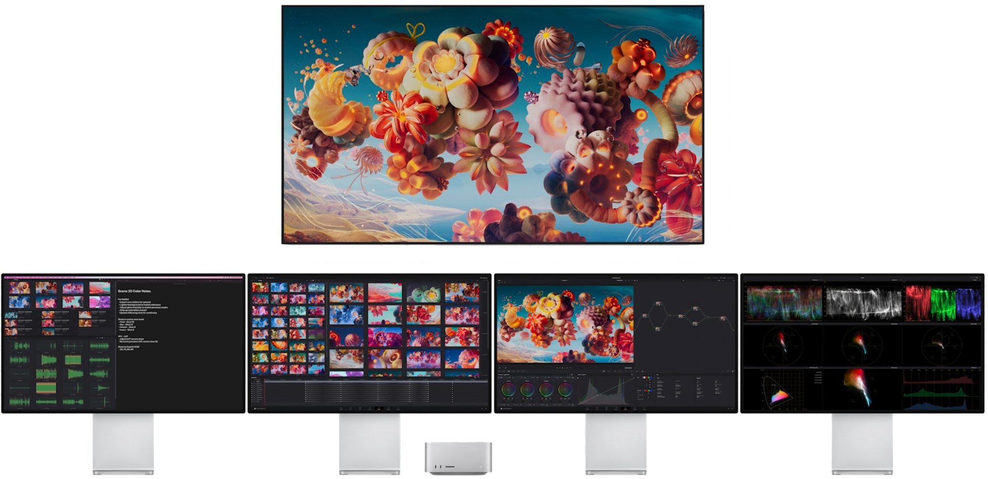 A Mac Studio akár öt vagy nyolc darab 6K-s kijelzőt, azaz akár Pro Display XDR kijelzőt is támogat a 4K-s HDMI televízió mellett.