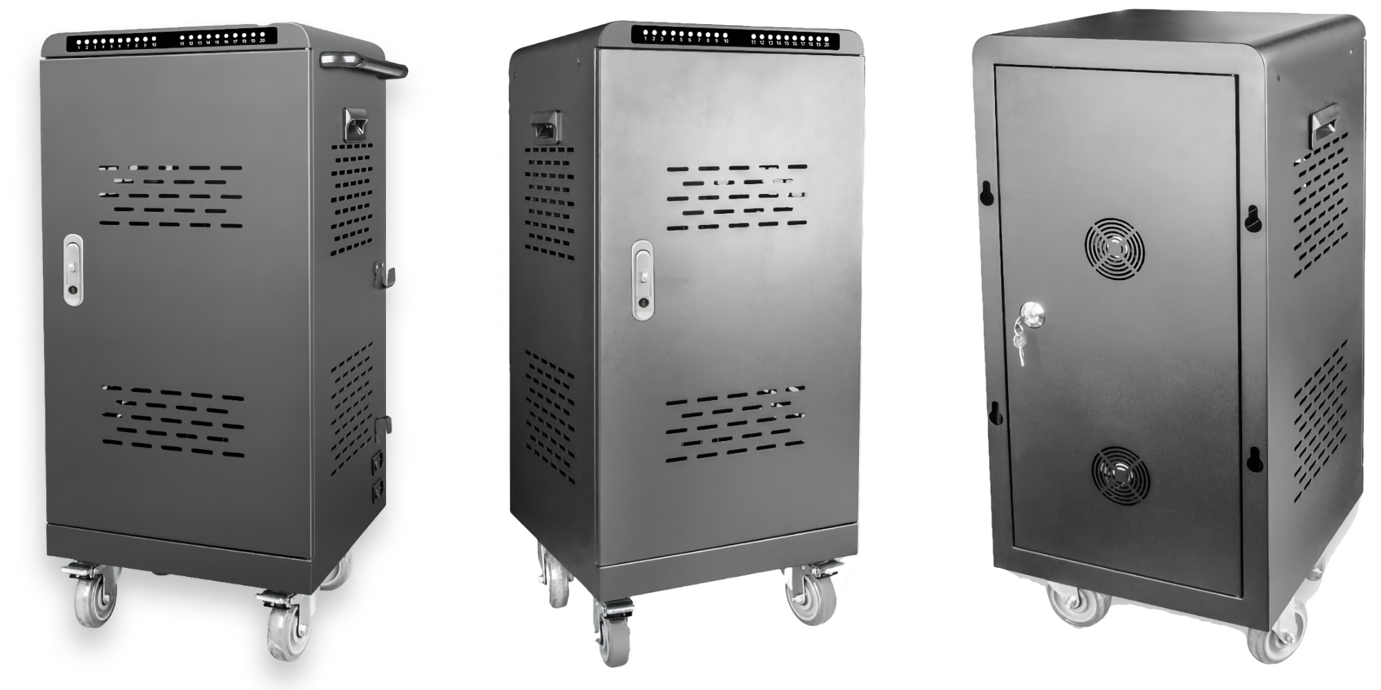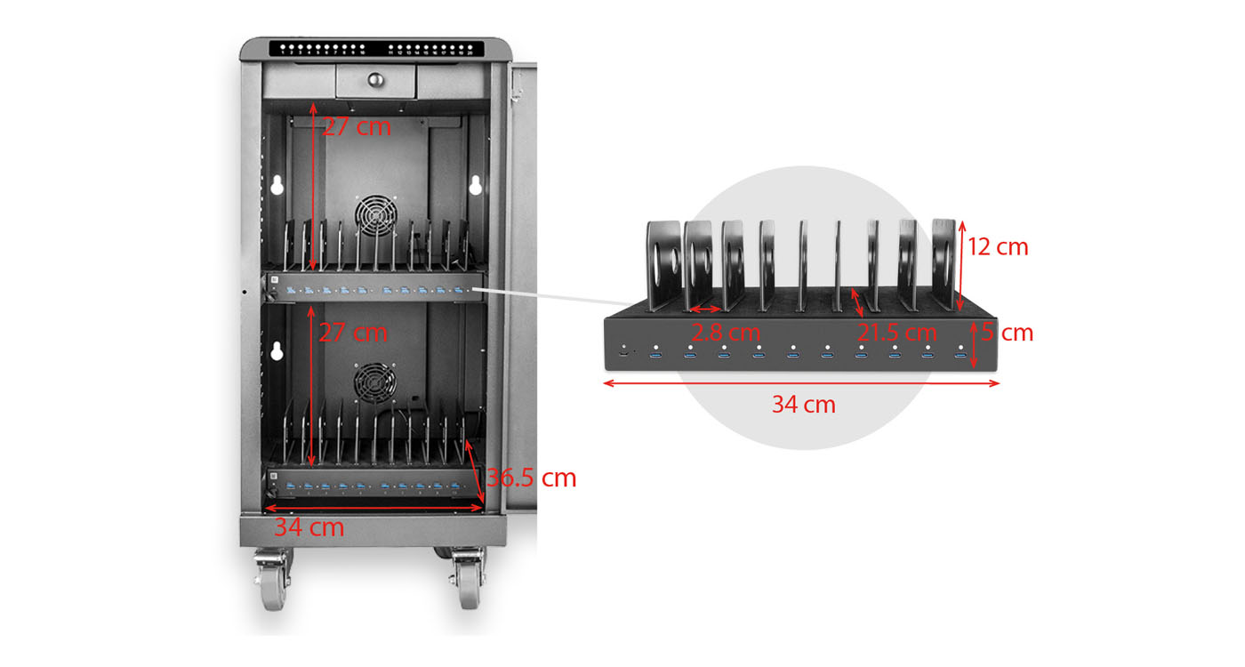 A zárható kialakítás különálló rekeszeket tartalmaz az eszközök biztonságos tárolására töltés vagy szállítás közben, míg a csúszásmentes felületek rendszerezve és védve tartják az eszközöket. A beépített LED-jelzők mutatják a töltési állapotot, a csendes ventilátorok pedig optimális üzemi hőmérsékletet biztosítanak.