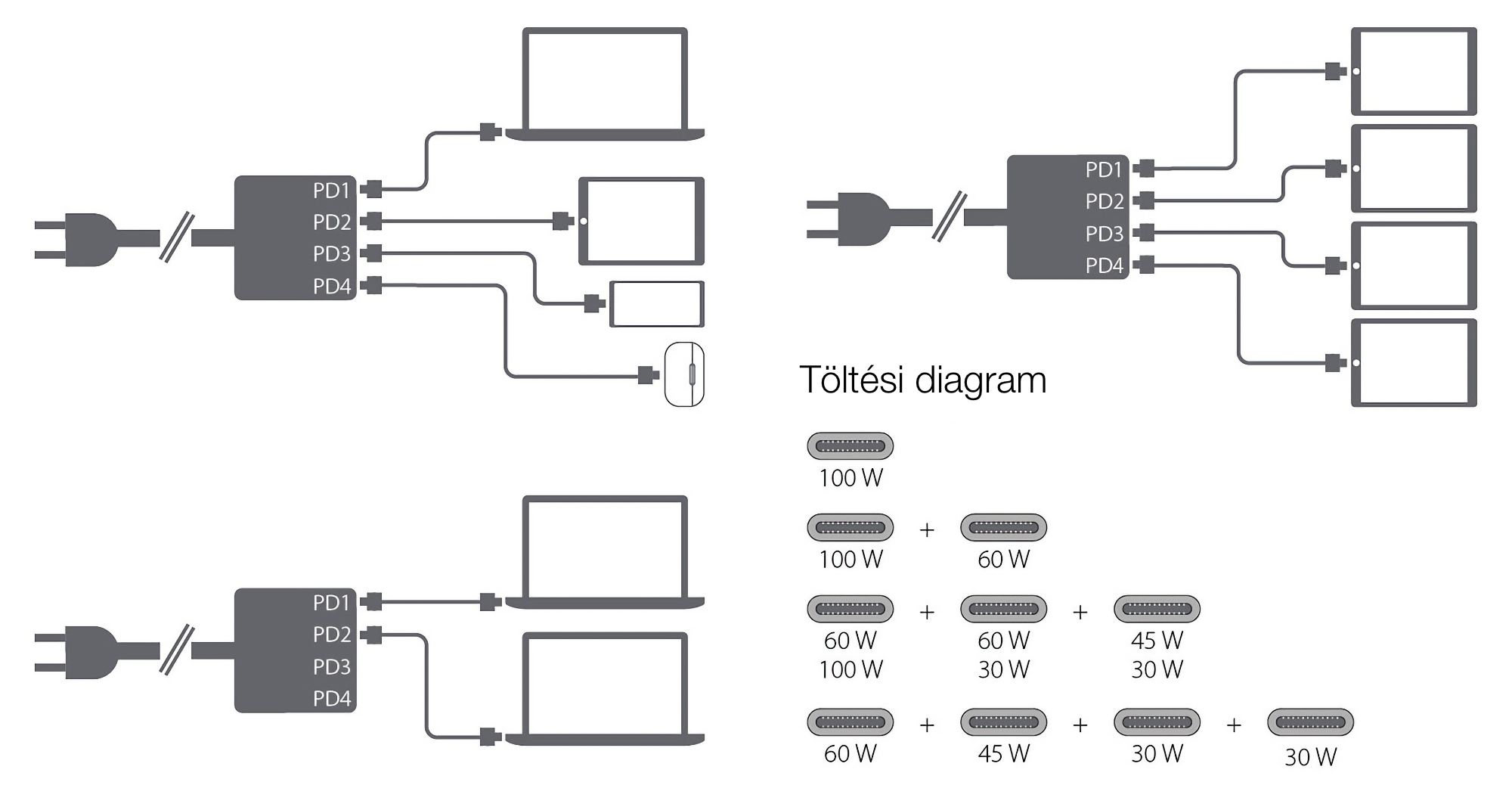 A felső három USB-C kapu bármelyike maximálisan 100 watt teljesítményre képes, míg az alsó kapu maximálisan 60 watt teljesítményre, így ennek megfelelően érdemes az eszközöket csatlakoztatni.