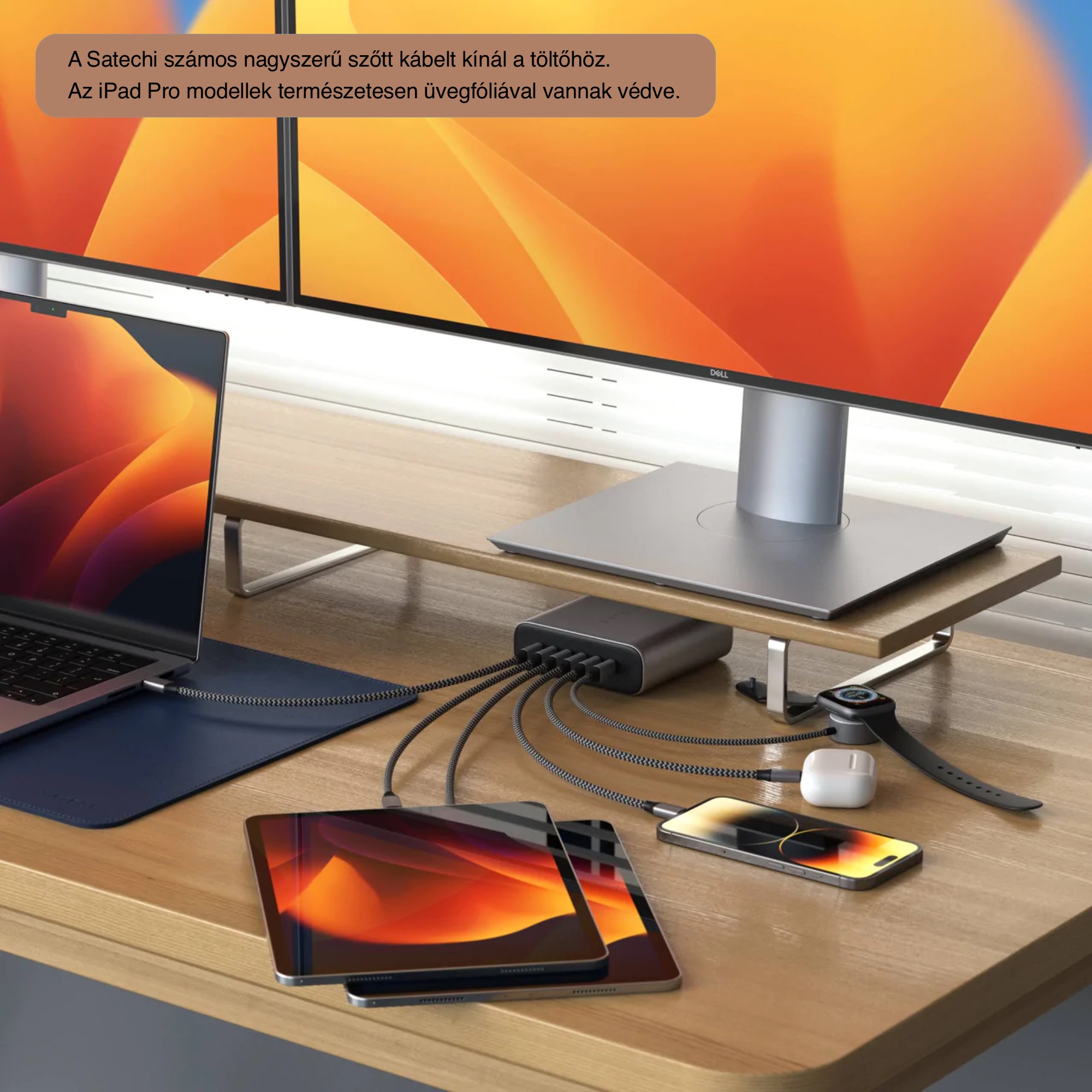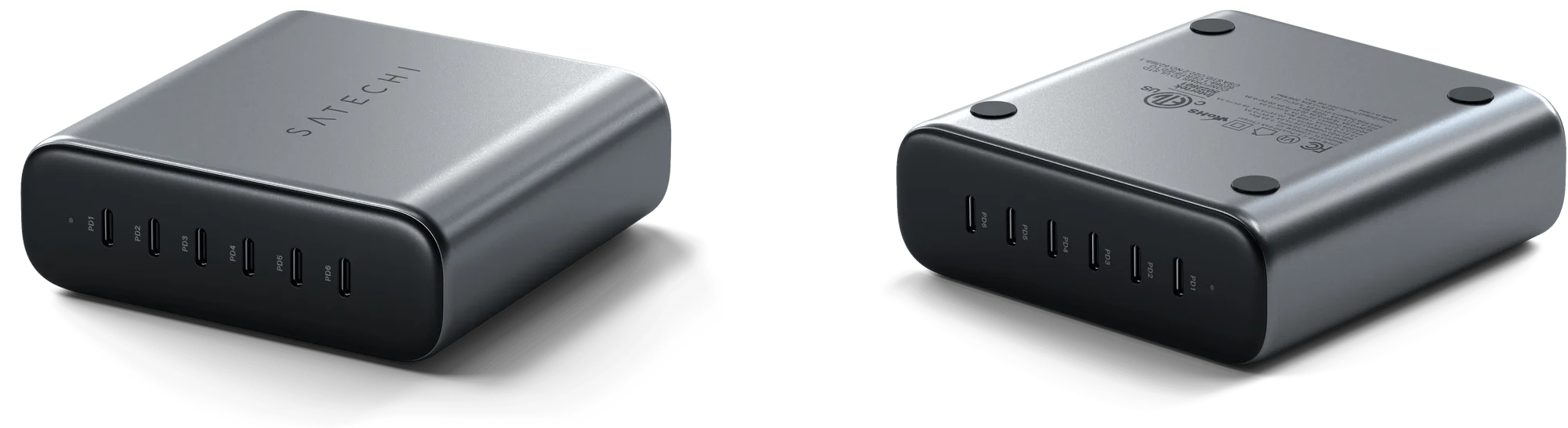 A Satechi 200 Watt USB-C GaN töltő a két igényt egyesítve képes kiemelkedő töltést biztosítani hatalmasnak mondható, 200 Watt összteljesítményével, amelyet ráadásul intelligensen képes szabályozni attól függően, hogy mennyi és milyen készülék van hozzácsatlakoztatva. Mindezt a megszokott alumínium burkolatú sötétszürke fém kivitelben kínálja fekete előoldali felülettel. Ez a töltő egység is folyamatosan élénk fénnyel világít, ha áram alatt van, amely a Satechi termékek esetén elkerülhetetlen paraméter. (A fény nem kapcsolható ki, így akit zavar egy folyton világító LED, annak ez a termék nem válik kívánatossá.)