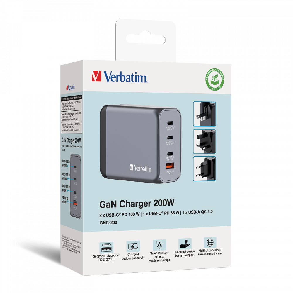 A Verbatim 200 wattos gallium-nitrid falitöltő megoldás alap kiszerelésében három régiót támogat: kihajtható amerikai dugói, illetve felhelyezhető európai és brit dugói vannak, vagyis külön befektetés nélkül meg van oldva az utazó töltő feladatköre is vele.