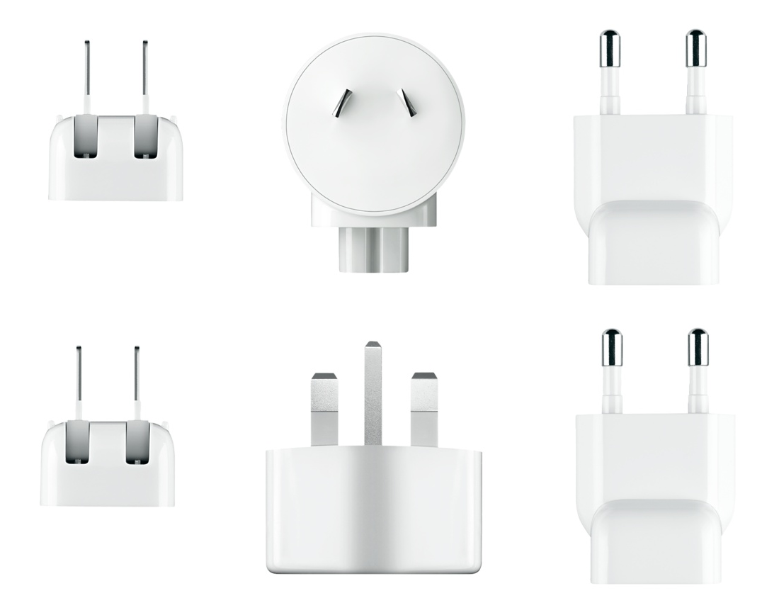 Az utóbbi területre, a cserélhető tápcsatlakozófej lehetőségének kiaknázására kínál az Apple egy ötletes világjáró csomagot, amely révén felszerelhetjük magunkat a legtöbb régió tápcsatlakozó szabványának megfelelő töltő fejekkel.