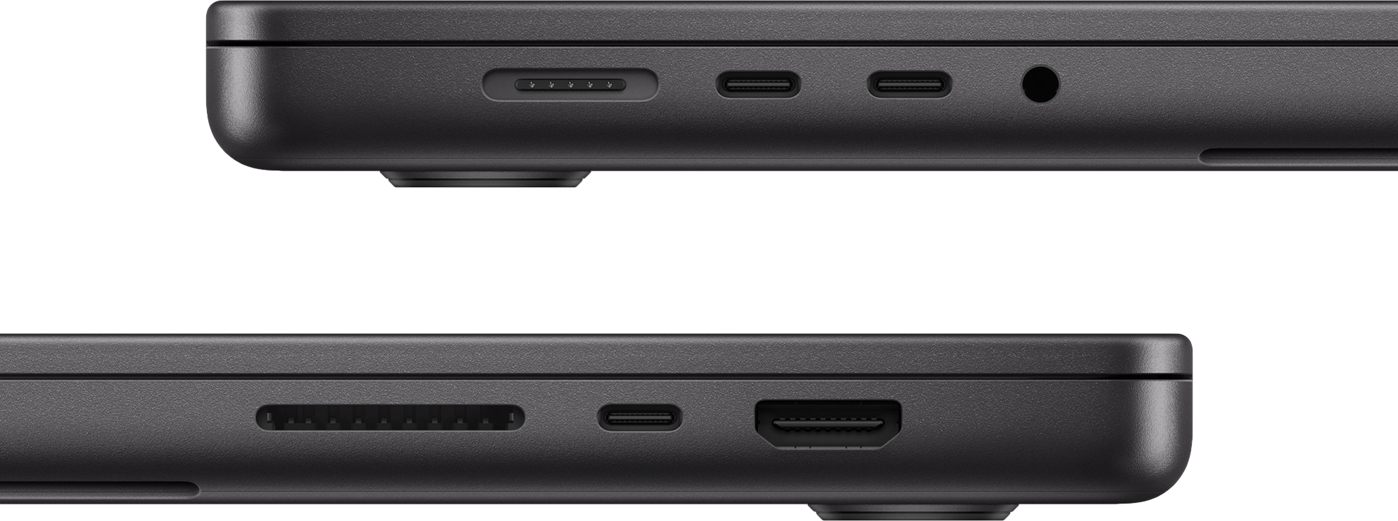A MacBook Pro 14" és MacBook Pro 16" M4 Pro és M4 Max processzoros verziói a Thunderbolt technológia legújabb, akár 120 Gb/s sávszélességet is biztosító ötödik generációjával, a Thunderbolt 5 kapuval felszerelve érkeznek, amely továbbra is USB-C formátumú, így meglévő perifériáinkkal kompatibilisek maradnak. Ebből három darab található a gépeken - kettő bal, egy pedig jobb oldalon.