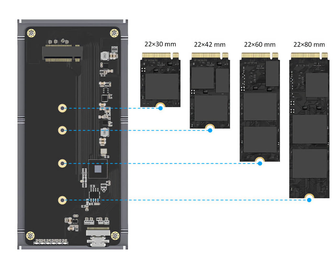 A 2280-as méret mellett a ház támogatja a 2260, 2242 és 2230 méretű meghajtókat is. Vagyis a 22 milliméter széles, és a következő két számjegy által milliméterben értendő számértékű hosszúságú meghajtókat.