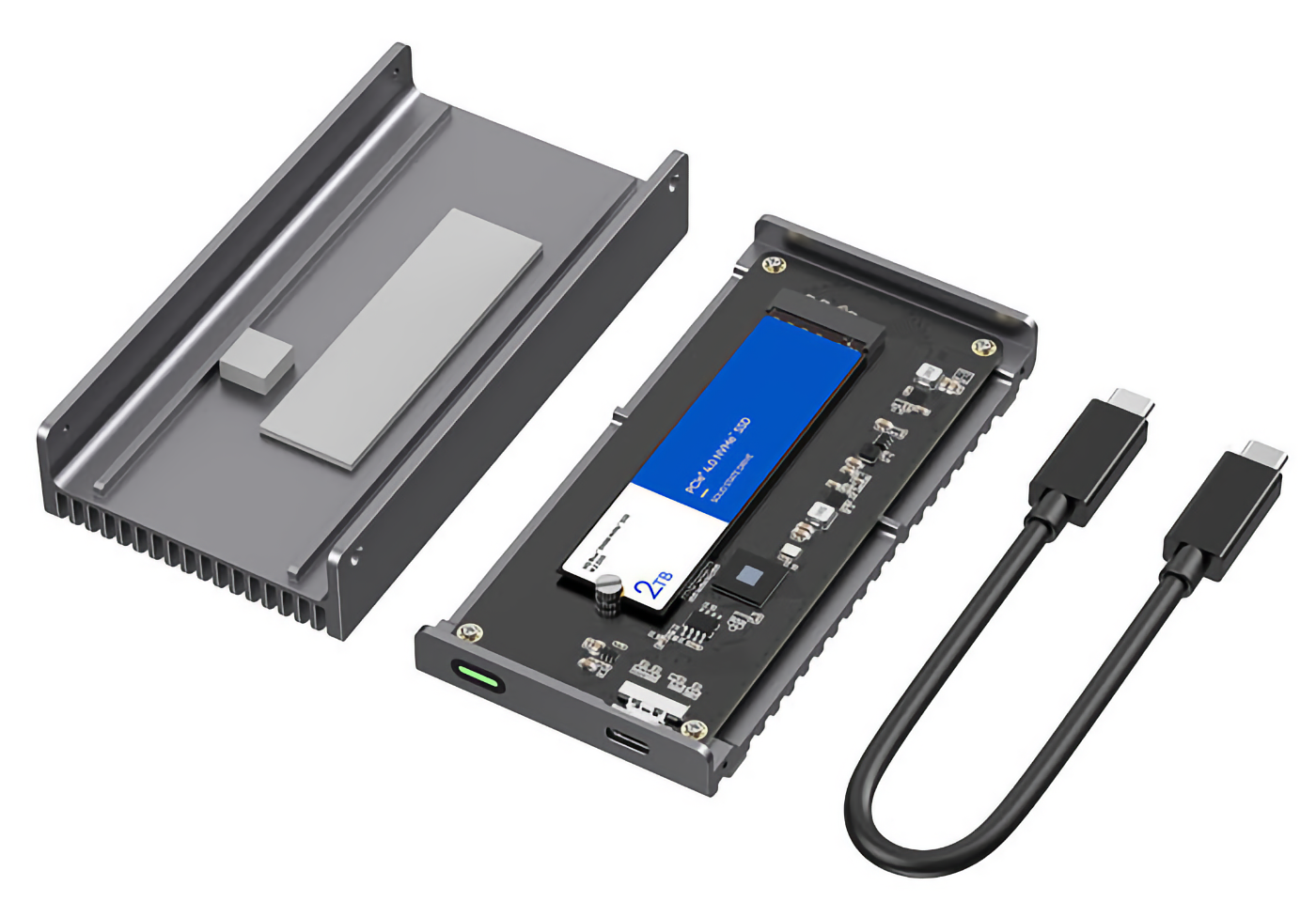 Az LMP DataFlash USB4 vékony dobozában egy finom kivitelű zsákban találjuk a terméket, valamint rövid USB4 kábelt és csavarhúzót az egység szétszedéséhez, az SSD beépítése céljából. Az alumínium kivitelű megoldás felső része rácsozott annak érdekében, hogy optimalizálja a hőelvezetést. A csomagban hőelvezető paszta is található - ez egyes esetekben külön van és fel kell ragasztani a ház felső részére az SSD fölé, más esetekben pedig gyárilag fel van ragasztva. Ennek logikáját nem sikerült kiismerni, de mellékelve van valamilyen formában a termékhez. A hőelvezető paszta segít abban, hogy az SSD által termelt hőt hatékonyabban vezethesse át az alumínium felületre, amely a hőt leadni hivatott. Ebből természetesen az is következik, hogy használat közben az eszköz nagyon meleg.