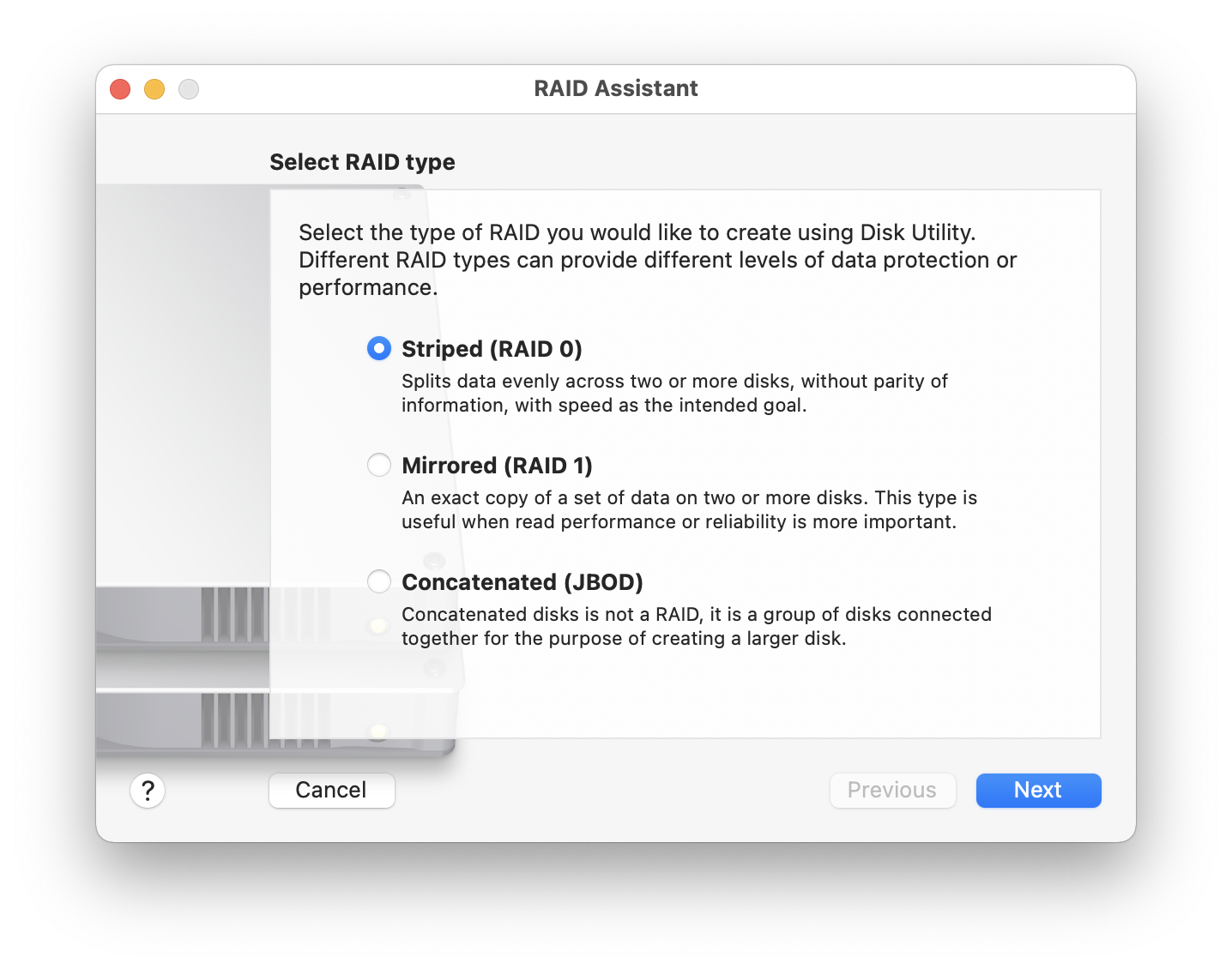 Megjegyzés: A macOS operációs rendszerben a Disk Utility / Lemezkezelő alkalmazás File / Fájl menüjének alján találjuk a RAID Assistant / RAID asszisztens nevű alkalmazását, amely segítségével a hardver által kínált RAID topológiák közül válogatva a tömböt létrehozhatjuk.