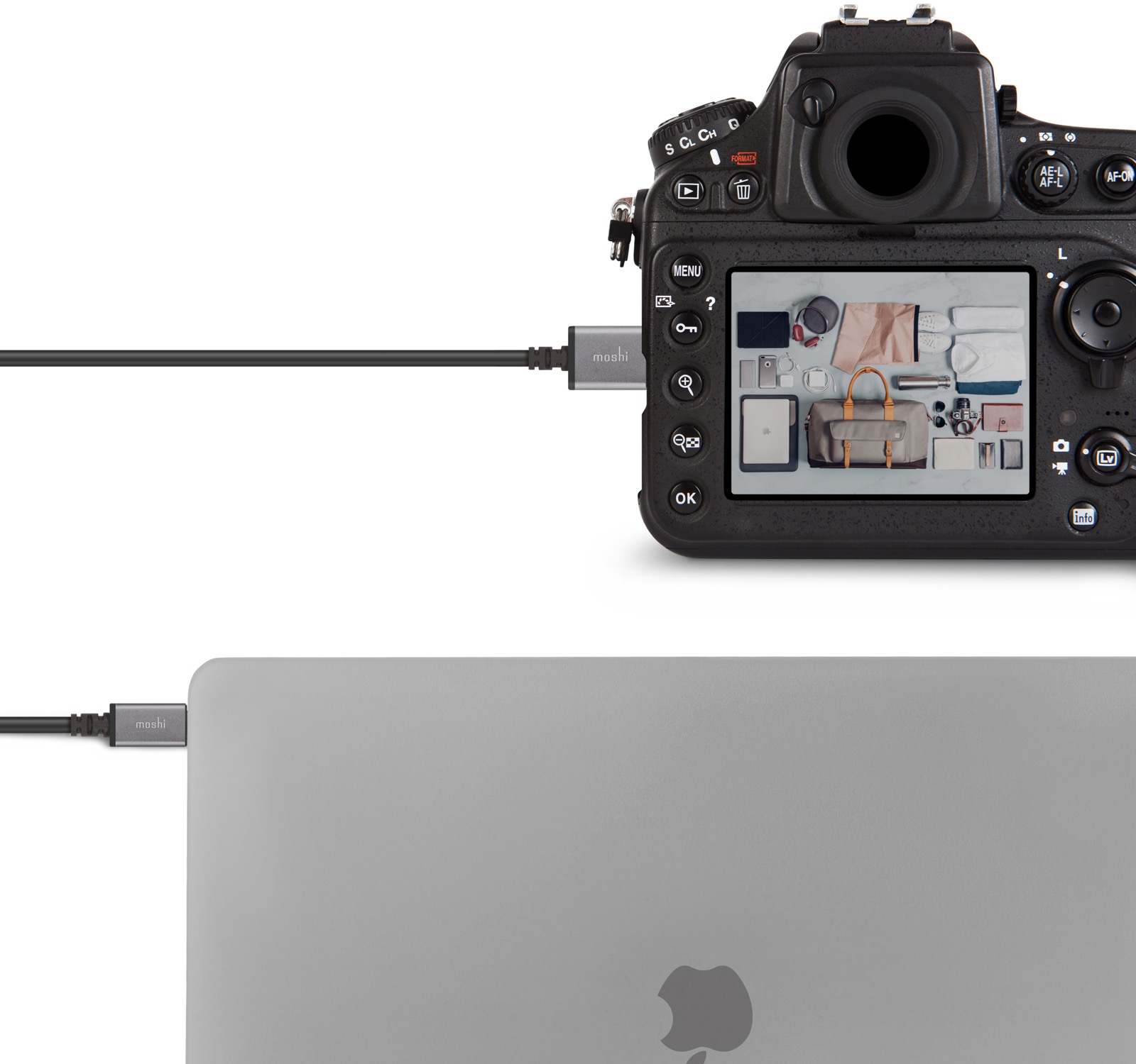 A Moshi USB-C USB mikró-B kábel sötétszürke-fekete színvilága jól illeszkedik az asztroszürke MacBook Air és MacBook Pro modellekhez - természetesen együtt használható a sima USB-C kapuval szerelt, régebbi, már kifutott MacBook modellekkel és a Thunderbolt 3 képességű MacBook Pro és iMac számítógépekkel is.
