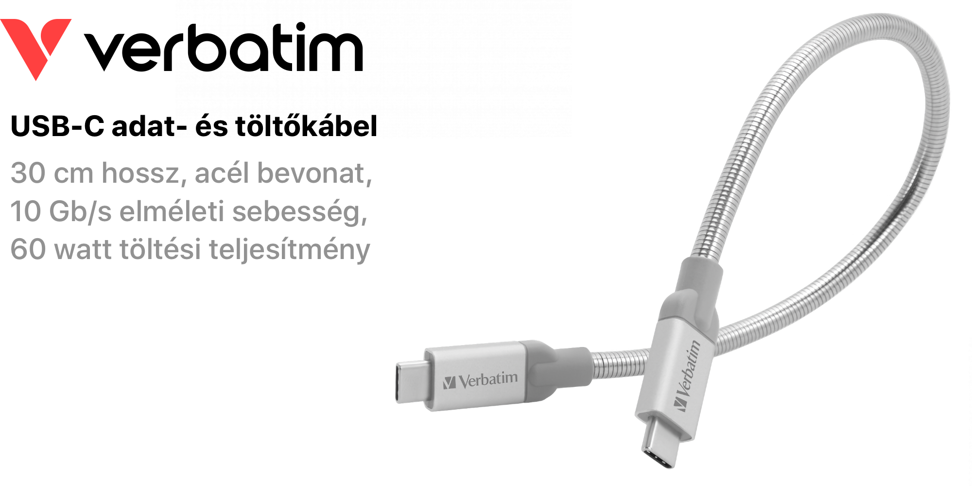 A Verbatim USB-C kábel rövidke, 30 centiméteres USB-C - USB-C szinkron- és töltőkábel. Rozsdamentes acél köpennyel rendelkezik (nem pedig egyszerű műanyag szigetelésű vezetékkel), és USB 3.2 szabványú – ami azt jelenti, hogy akár elméleti 10 Gb/s adatátviteli sebességet és 3 Amper áramerősség mellett akár 60 wattos töltést is biztosít a csatlakoztatott eszköz - iPhone, iPad, MacBook Air - számára.
