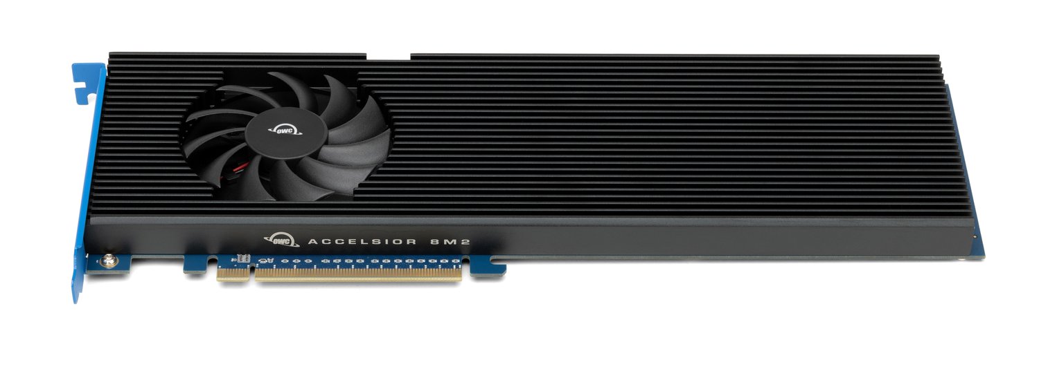 Az NVMe technológiát alkalmazó, tehát PCI Express alapokra épülő szilárdtest meghajtók kis méretűek, kapacitásuk akár 8 TB, standard méretük okán pedig számos megoldás létezik arra, hogy egységnyi helyre többet sűrítsünk össze. Az OWC Accelsior 8M2 PCIe kártya helyet biztosít 8 darab M.2 csatlakozós NVMe SSD számára, így 32 TB vagy 64 TB tárhelyeket hozhatunk létre, amelyek a Mac Pro M2 Ultra processzoros változatában akár 26000 MB/s egyesített átviteli teljesítményt biztosítanak a PCIe 4.0 kapcsolat révén.