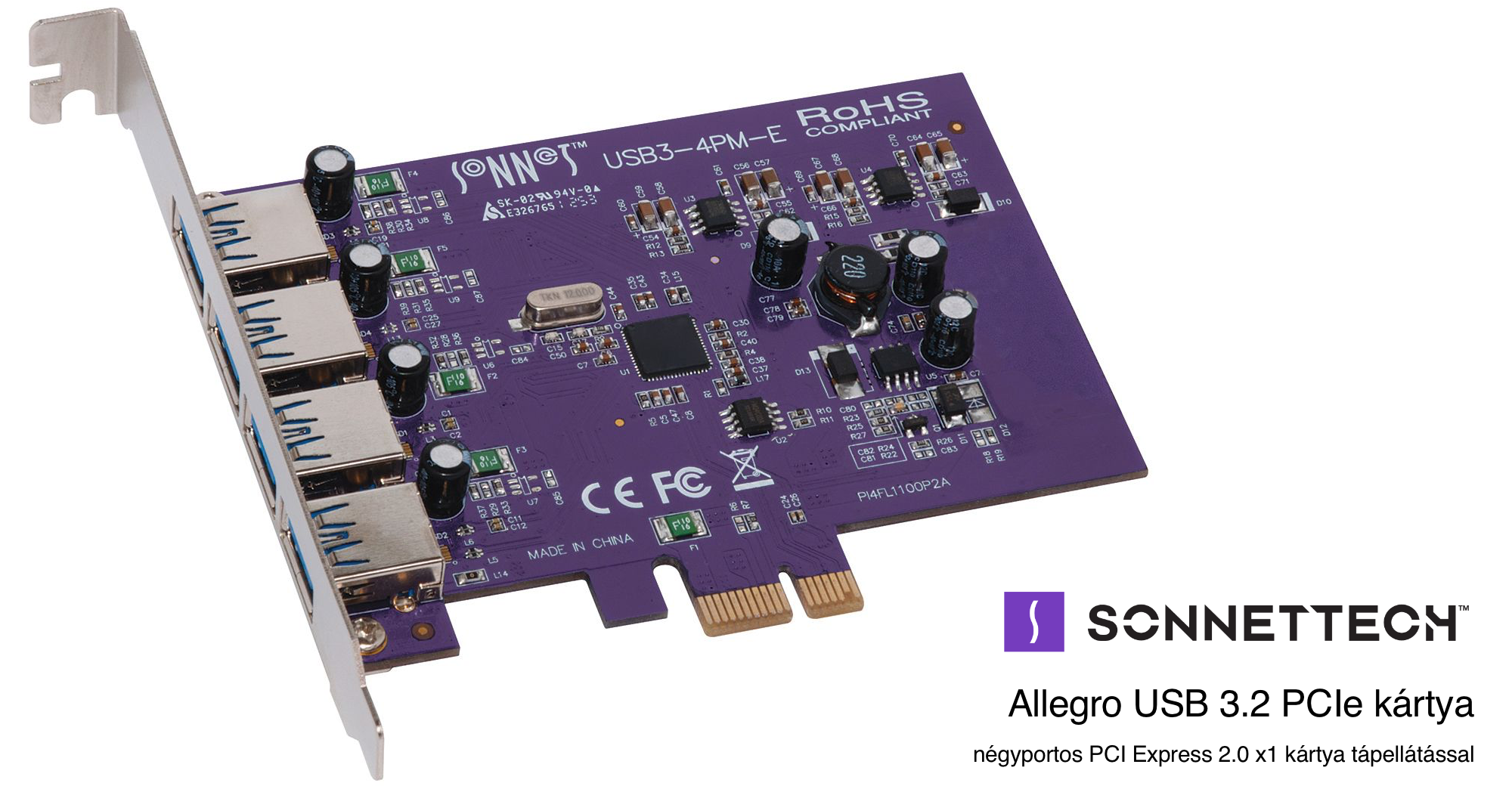 A PCI Express 2.0 kapcsolattal rendelkező szürke házas Mac Pro modellek felhasználói számára az USB 3 kapcsolat az elérhető legnagyobb átviteli sebességet nyújtja, és az USB 2.0 szabványnál akár tízszer gyorsabb tényleges kapcsolatot biztosít. A Sonnet Allegro USB 3.2 PCIe kártyája alkalmas a MacPro3,1 modelleknél fiatalabb gépek USB-A 3.2 csatakozókkal való ellátására a PCI Express 2.0 foglalat használatával.