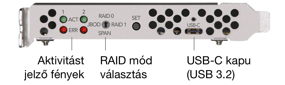 A Sonnet Fusion 2,5” SSD RAID PCI Express kártya hardveres RAID vezérlője egyébként a RAD0 és RAID1 topológiák mellett támogatja a JBOD (Just a Bunch of Disks) és a közös meghajtó RAID nélkül (Span) opciókat is. A RAID megoldások beállítása a kártyán lévő, elforgatható gomb segítségével történik. A kártya külsején egyébként aktivitás jelző és hiba jelző LED fények is találhatóak. A RAID opciót egy elforgatható gombbal és a SET gomb nyomásával tudjuk módosítani.