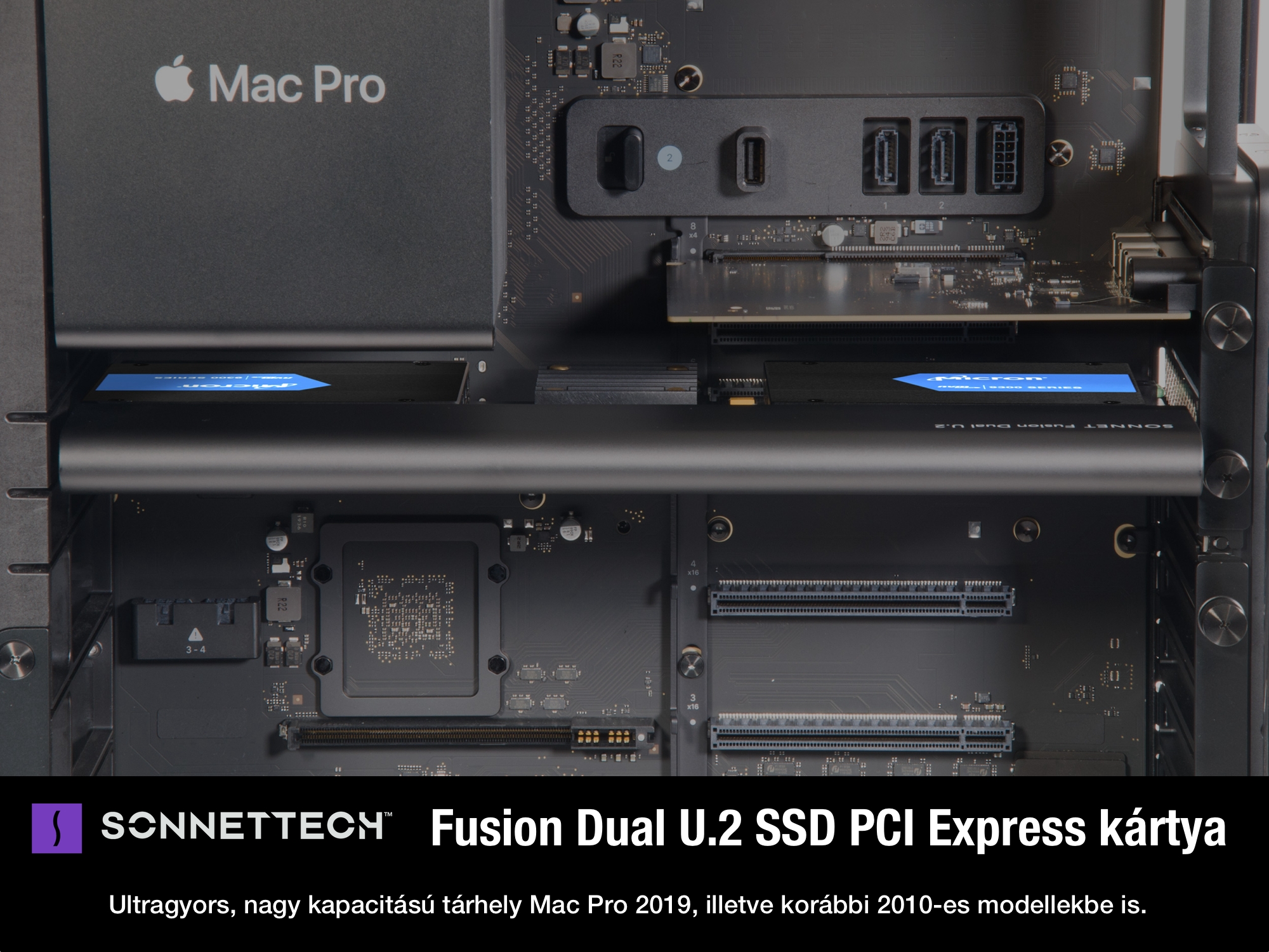 A Sonnet Fusion Dual U.2 SSD PCIe kártya a Mac Pro elképesztően rugalmas belső bővítési lehetőségeit kiaknázva a gyári, alaplapra integrált tárhellyel azonos gyorsaságot kínálja, de lényegesen nagyobb kapacitással és az Apple tárhely árazásához képest töredék árakon.