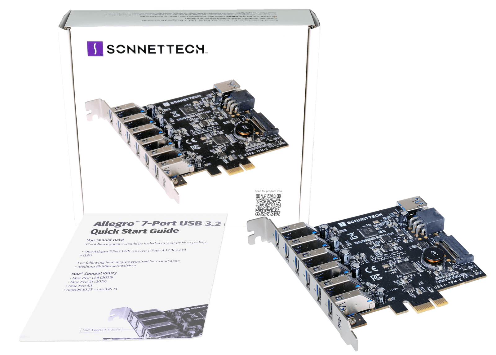 A Sonnettech Allegro 7-Port USB 3.2 Gen 1 Type A PCIe Card rendkívül kis mérete révén gyakorlatilag bármely PCIe bővítőhelyre beilleszthető. Nem szükséges meghajtóprogramot telepíteni a működéséhez, mivel ipari szabványokat használ, amelyeket támogatnak az operációs rendszerek. Így támogatja az USB-IF megfelelőségű kiegészítők csatlakoztatását. A termék PCI Express 2.1 x1 technológiát alkalmaz, vagyis számos régebbi Mac Pro modellel is kompatibilis. Teljes magasságú, ám rendkívül rövid kártya, így akár egy Sonnet Echo Express SEL egységbe is belefér.