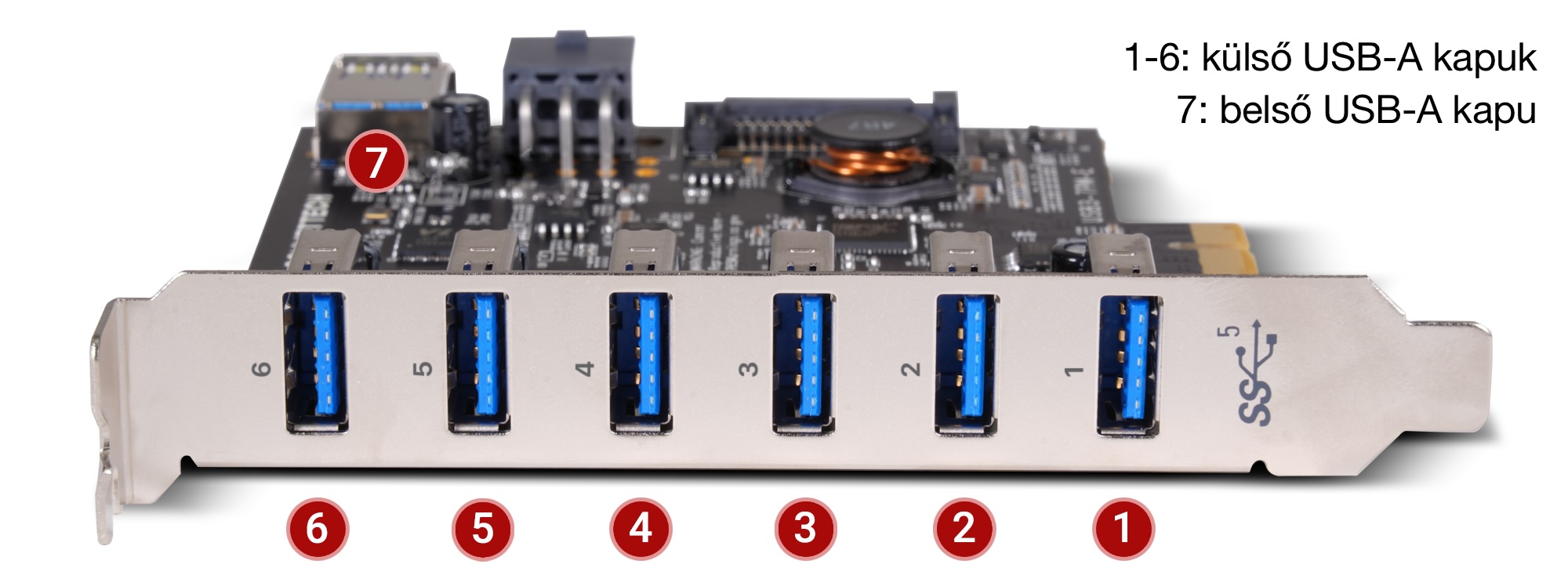 A Sonnettech Allegro 7-Port USB 3.2 Gen 1 Type A PCIe Card összesen hét darab USB-A kapuval rendelkezik, amelyek egyike belső, így a gépen/házon belül van lehetőség valamilyen eszköz csatlakoztatására, amelynek jelenléte folytonosan szükséges. Ilyen lehet például egy hardverkulcs, amelyet nem szeretnénk kihúzni sosem a gépből, vagy egy olyan USB-A csatlakozós meghajtó, amelynek állandó jelenléte hasznos. A hat darab külső kapu pedig úgy van elhelyezve, hogy kényelmesen hozzáférhetőek legyenek az eszközök számára.