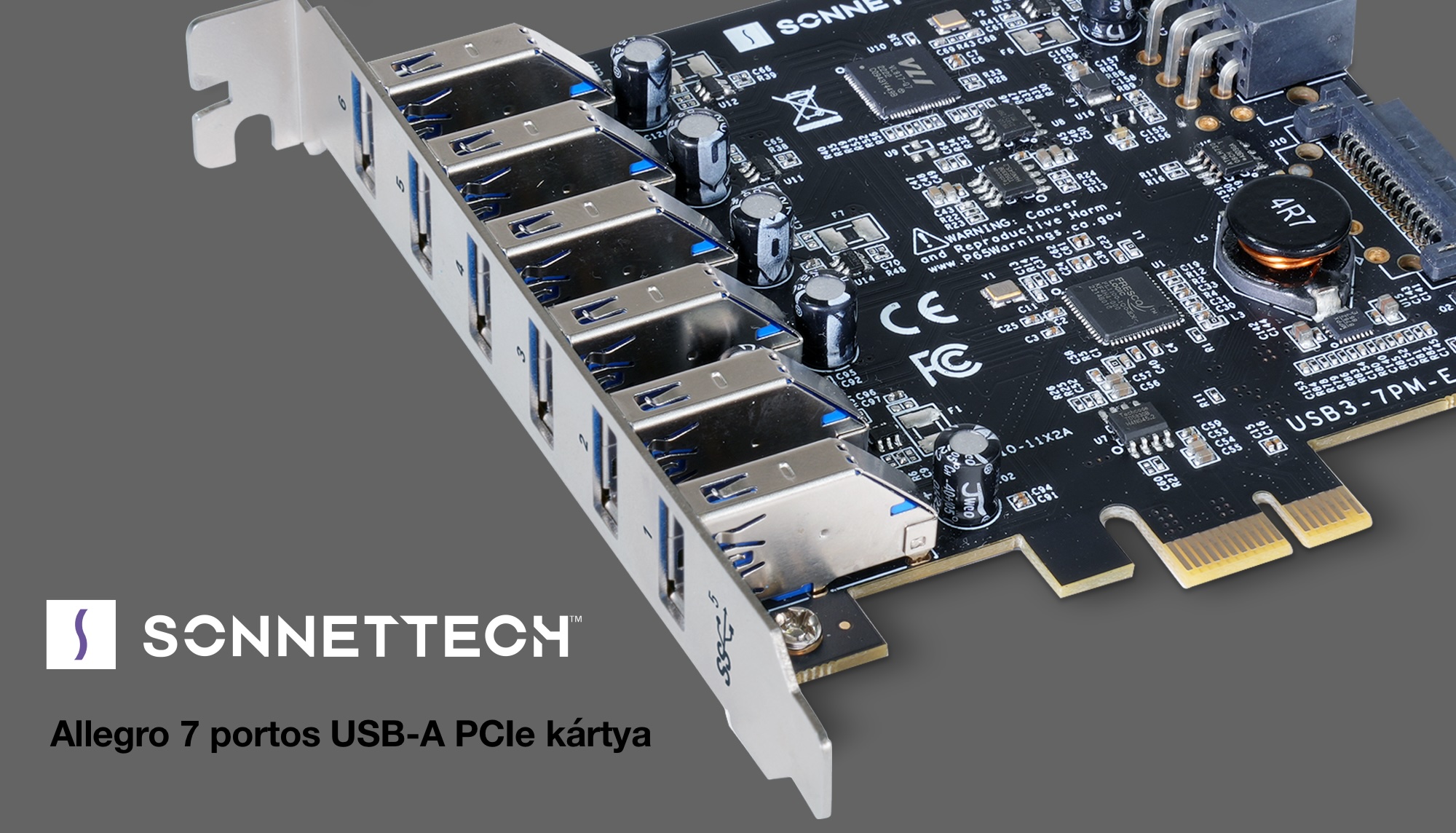 A Sonnettech által alkotott hét darab USB-A kapuval rendelkező PCI Express kártya az ilyen csatlakozóval szerelt eszközök tömeges jelenlétére reagál, és nyújt praktikus kiegészítőt a Mac Pro tulajdonosok, valamint a PCI Express foglalattal rendelkező felhasználók számára. Ez a típusú kártya akkor is hasznos, ha a PCIe foglalaton marad egy szabad hely, ahová nem tervezünk más, a munkafolyamathoz szükséges kártyát rakni, de szeretnénk hasznos lehetőséggel kitölteni az üresen maradt helyet költséghatékonyan.