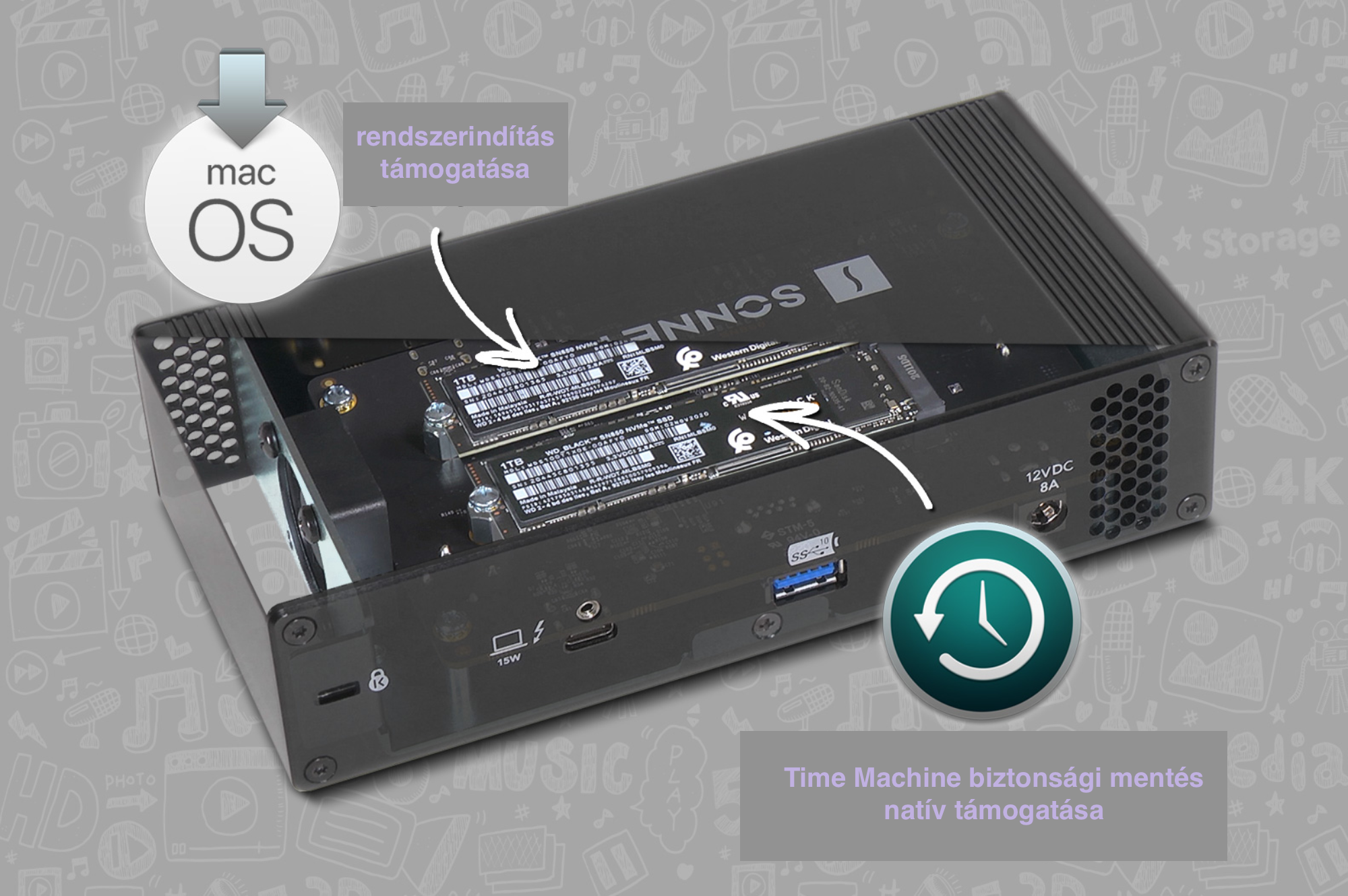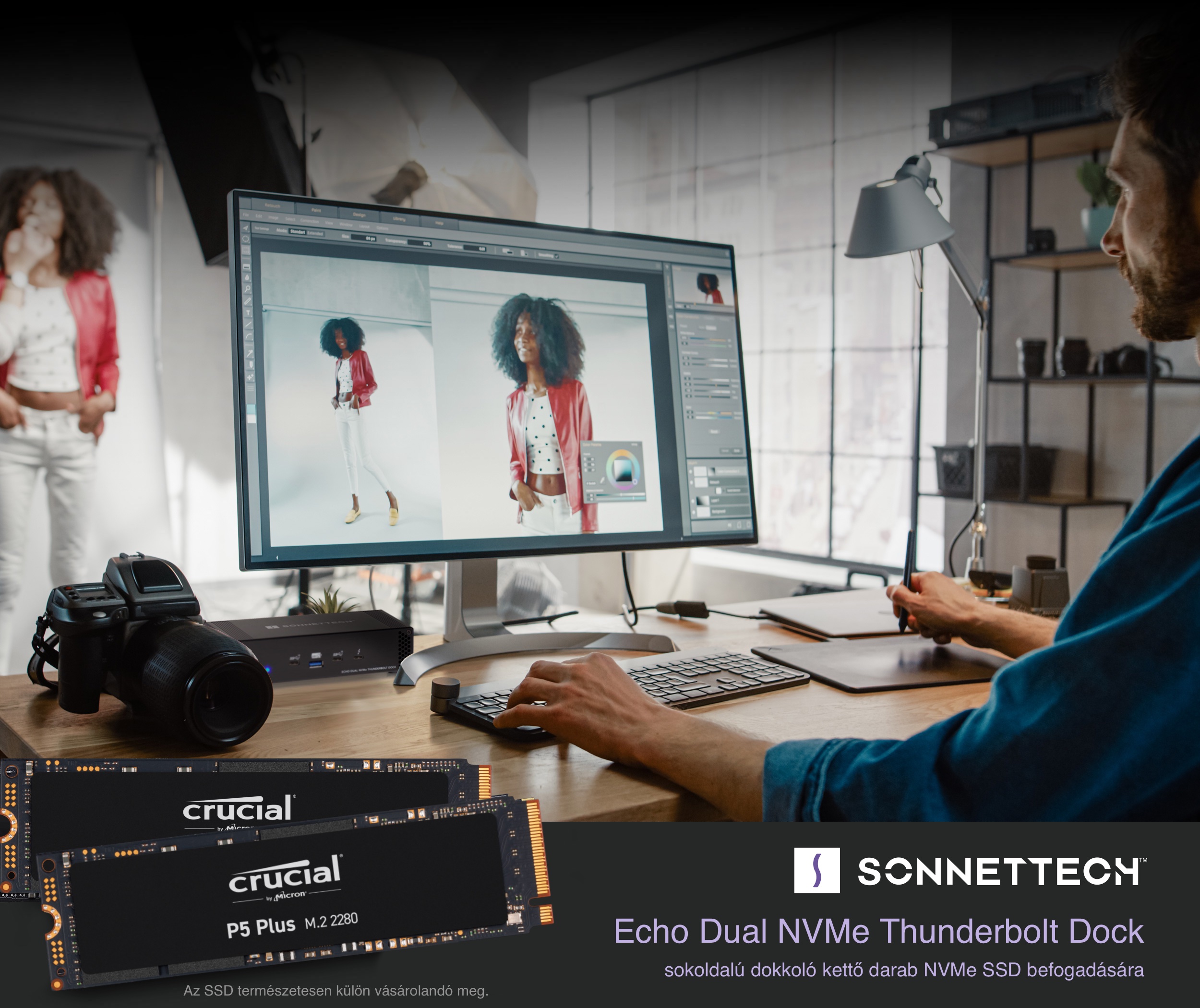 A Sonnet az elsők között mutatott be Thunderbolt 3 dokkot a Mac világ számára, és felismerte annak jelentőségét, hogy a dokkolónk ne csak egy port elosztó megoldás legyen, hanem egy sokoldalú és gyors tárhely is, amelyet például videós produkcióink tárolására és gyors elérésére is használhatunk. A Sonnet Echo Dual NVMe Thunderbolt Dock megoldás kettő darab ultragyors NVMe szilárdtest meghajtó befogadására alkalmas, mint a Crucial P3 széria, amely révén nagy kapacitású és igen jó elérési időt biztosító tárhelyet alakíthatunk ki. Más márkák esetén akár nagyobb kapacitású megoldások is elérhetőek, így akár 2 x 8 TB tárhelyet is kialakíthatunk.