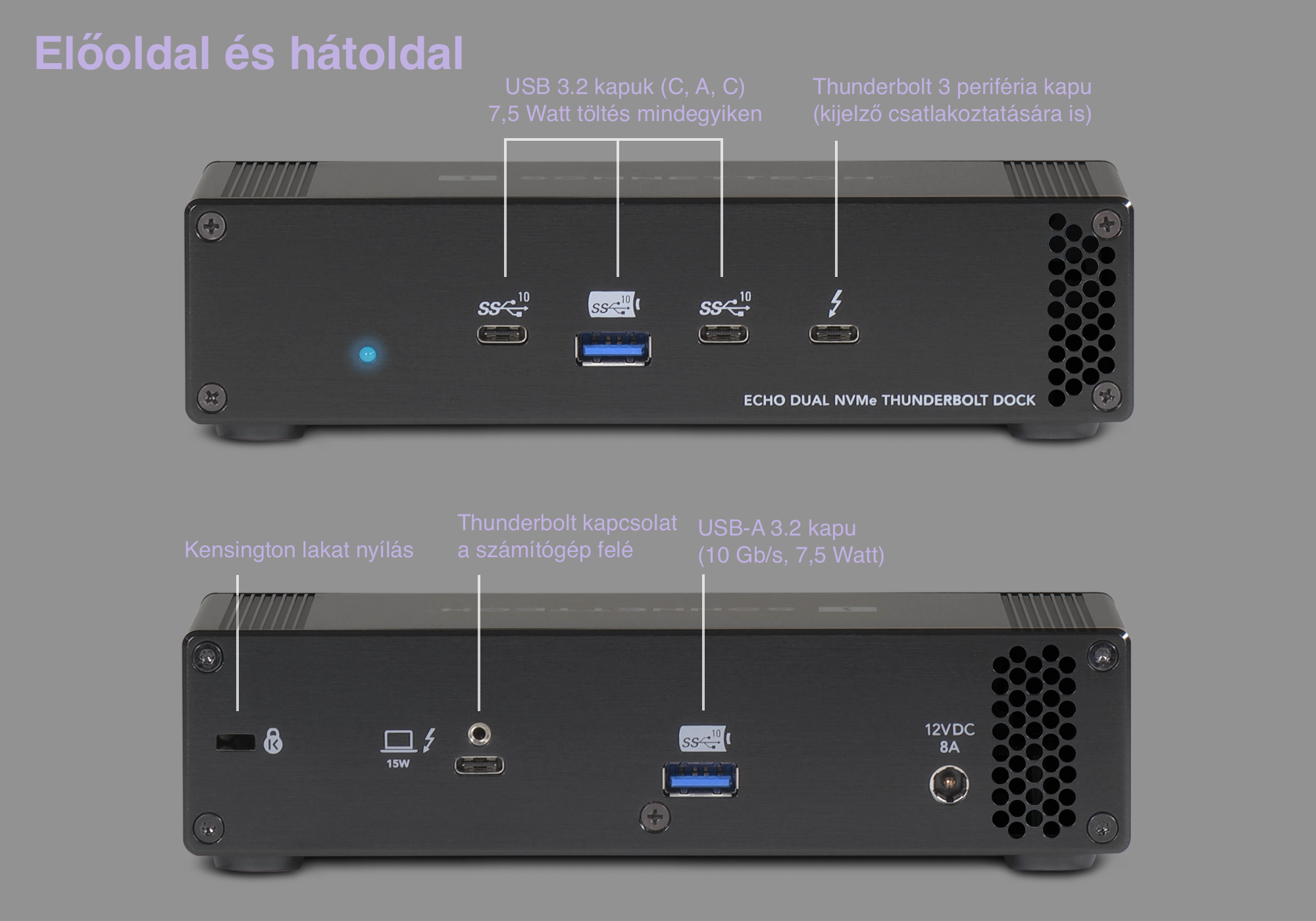 A hátoldalon a számítógéphez vagy iPad Pro modellhez kapcsolatot biztosító, USB-C formátumú Thunderbolt 3 kapu található meg, amely 15 Watt töltést is biztosít a gazdagép számára, amely főként az iPad Pro modellek számára előny. Mellette egy USB-A 3.2 kapu található elméleti 10 Gb/s sebességgel. A hátoldalon találjuk a 12 Voltos, 8 Amperes tápegység csatlakozóját, valamint egy Kensington biztonsági lakat nyílást a termék rögzítéséhez irodai környezetben.