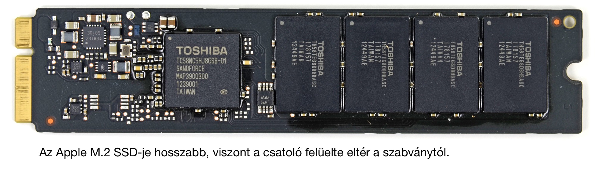 Az Apple ezen a területen némileg nehézségeket görget a felhasználók elé, mivel az M.2 csatoló szabványnak egy eltérő megjelenését alkalmazzák, vagyis nem tudunk bármilyen SSD-t a gépekbe rakni. Ez ugyan kellemetlenség, hiszen így drágább a bővítés, ám előnye is van, ugyanis nem kerül a gépbe olyan meghajtó, amely nem tökéletesen kompatibilis.