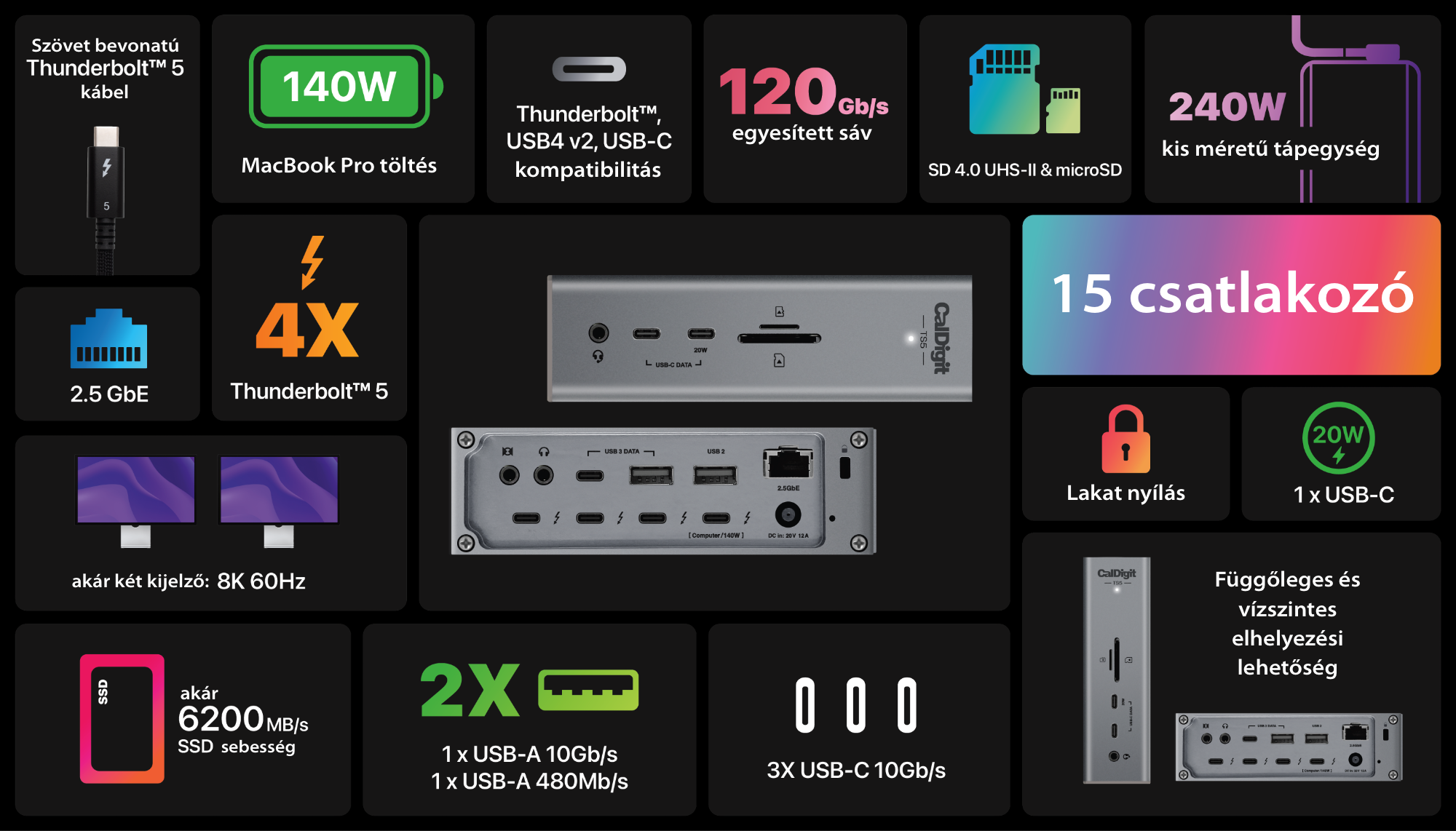 E képességek kiaknázásához a terméken lévő Thunderbolt 5 csatlakozók jelentik a kulcsot, amelyhez Thunderbolt alapú kijelzőt vagy átalakítóval másféle kijelzőt csatlakoztathatunk. A CalDigit kínál USB-C DisplayPort átalakítót, illetve USB-C HDMI átalakítót is a kor legmodernebb követelményeinek megfelelő paraméterekkel.
