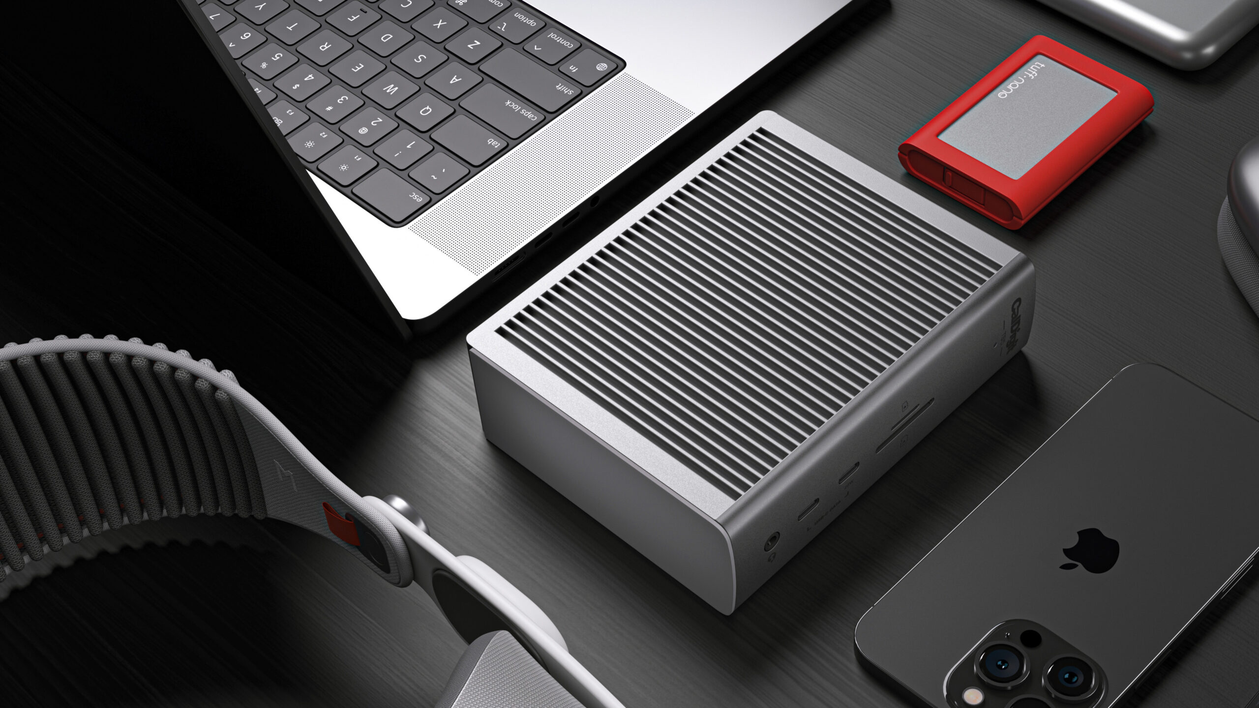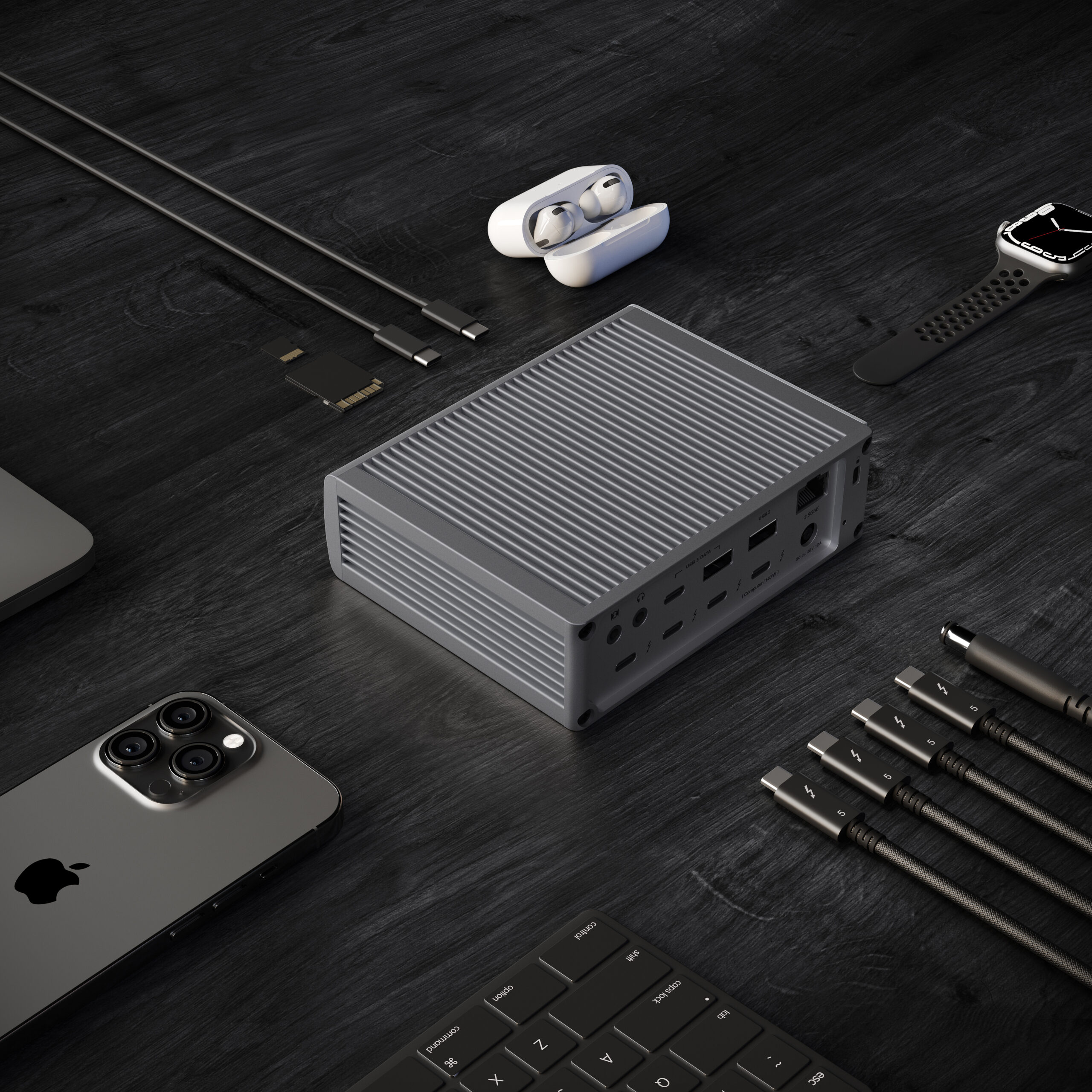 Kiemelkedő előny, hogy a terméken összesen három darab, a Thunderbolt 5 kapuktól teljesen különálló USB-C kapu is található, amelyek révén például az iPhone készülékünket tudjuk csatlakoztatni töltés és fotók és videók letöltése céljából, de akár egy OWC 1M2 külső foglalatot is 10 Gb/s sebességgel. Ezek a csatlakozók használhatóak bármilyen olcsóbb USB-C eszköz csatlakoztatására.