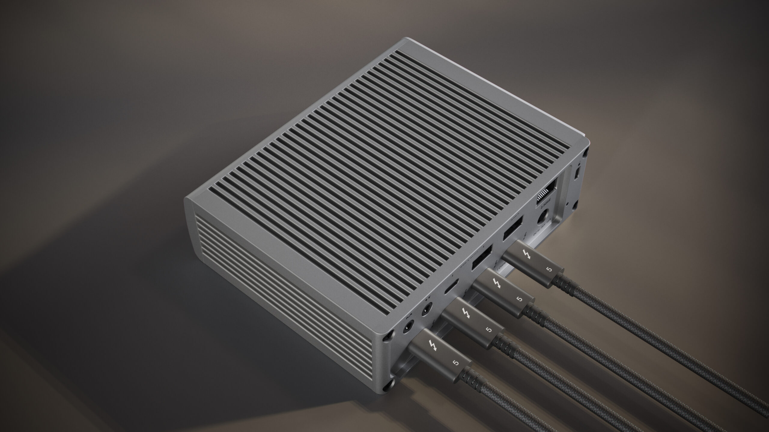 A csatlakozók között a három szabad Thunderbolt 5 kapu található, amely videó kimenetként is alkalmazható DisplayPort ALT MODE segítségével, a szabad USB-C 3.2 kapuk és a 2,5 Gigabites Ethernet hálózati kapcsolat is rendelkezésre áll.