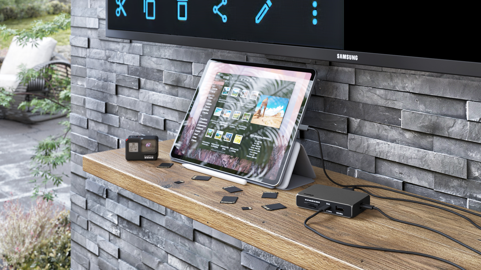 A Mac és iPad Pro kapcsolatát a termék Computer feliratú USB-C kapuján át teremthetjük meg, fontos azonban, hogy erre a célra a mellékelt kábelt használjuk - itt nem jó bármilyen USB-C kábel, és különösen nem alkalmas a kapcsolatra az Apple gyári USB-C töltőkábele, mivel az csak töltésre használható, átviteli képessége az ára ellenére USB 2.0 szinten reked meg.