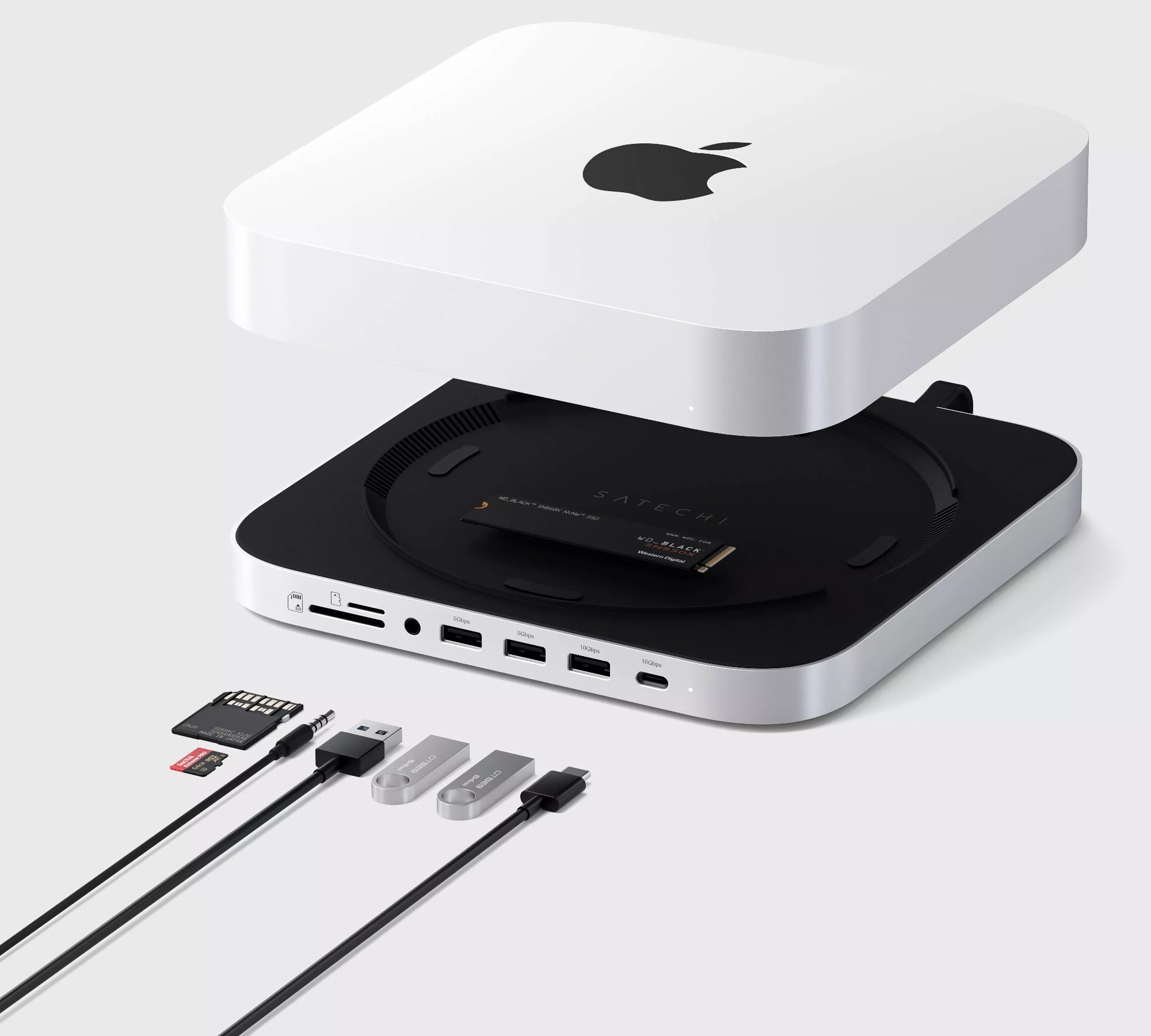 A Satechi számos népszerű alátét megoldást alkotott a Mac mini modellekhez, amelyek formájuk okán a Mac Studio eszközökkel is kompatibilisek. A 2024-es CES rendezvényen mutatta be a kaliforniai gyártó a logikus fejlődési útnak tekinthető újabb megoldását, amely alapvetően annyi változást biztosít, hogy immáron NVMe technológiájú SSD modulok befogadására is alkalmas, vagyis a jóval gyorsabb és modernebb, PCI Express technológiára épülő szilárdtest meghajtók beépítését is támogatja, ezáltal nagyobb kapacitásra is megnyitja a lehetőséget.