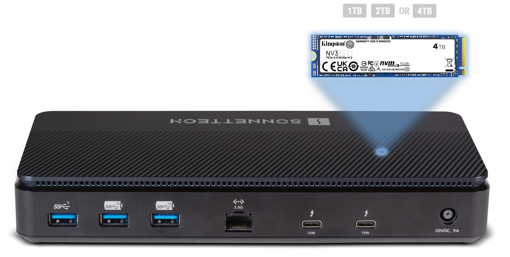 Újszerű megoldás a Sonnettech Echo 13 Thunderbolt 5 SSD Dock esetén a beépített, előre konfigurált tárhely. A gyártó ennek jóvoltából 6100 MB/s valós olvasási és 4000 MB/s írási sebesség elérését ígéri, amely reális teljesítménye a Thunderbolt 5 sebességnek. (Thunderbolt 3 és Thunderbolt 4 kapcsolat esetén 3400 MB/s olvasási és 2160 MB/s írási sebesség érhető el.) A Kingston PCIe 4.0 NVMe SSD opciók 1 TB, 2 TB vagy 4 TB kapacitással érhetőek el, és mint előre konfigurált termék, az információtechnológiai világ piaci versenyárai nem hatnak rá, vagyis a belső tárhely okán a termék ára magasabb, mint ahogyan azt megszoktuk.