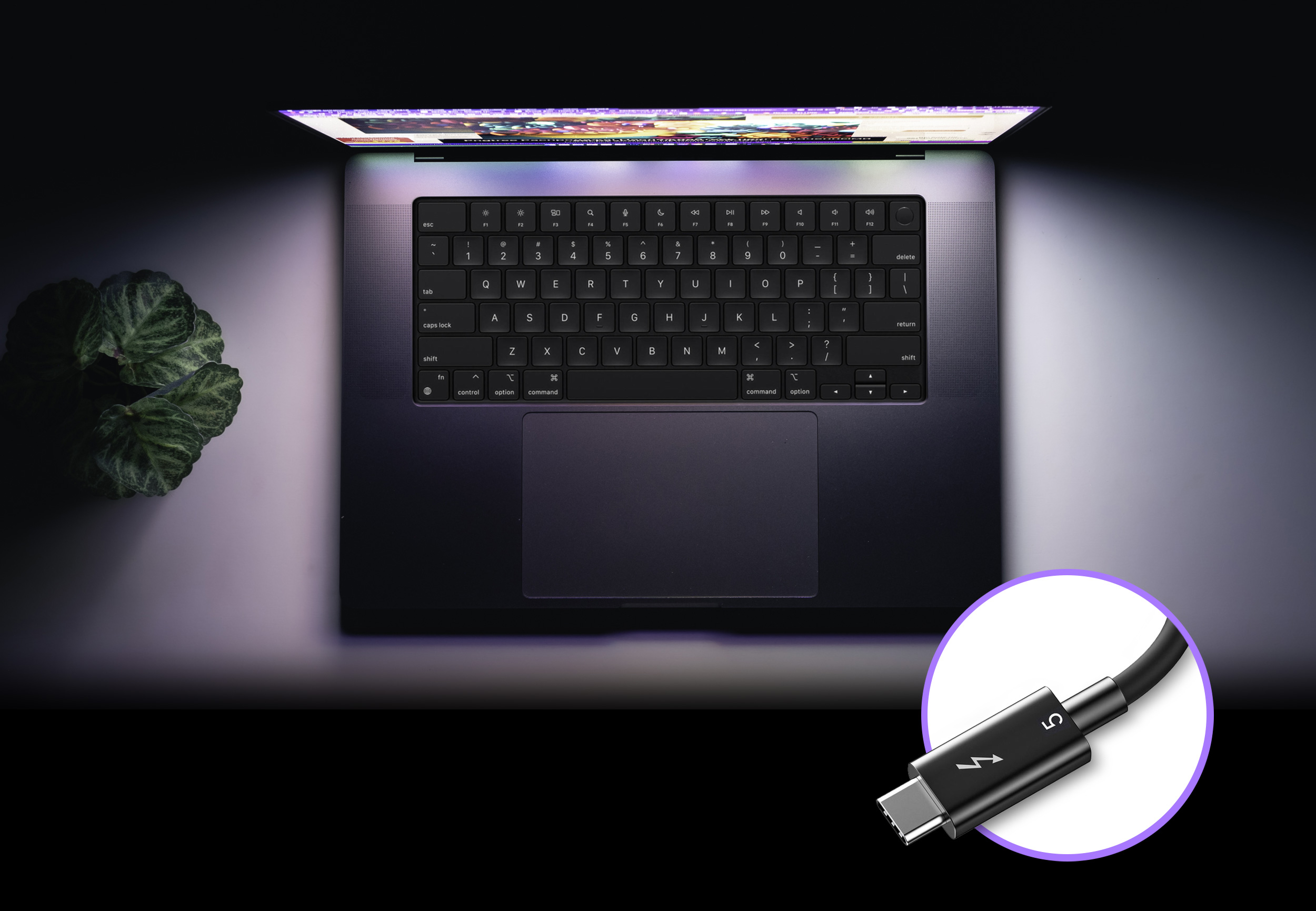 • Négy darab Thunderbolt 5 kapu, amelyek egyike a Mac-hez csatlakozást biztosítja