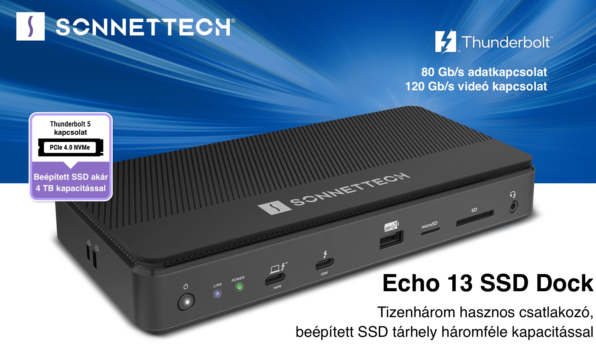 A Sonnettech első Thunderbolt 5 terméke az Echo 13 Thunderbolt 5 SSD Dock nevű megoldás, amely több téren is újszerű a gyártó kínálatában: a Thunderbolt 5 kapcsolat révén kiemelkedő sávszélességet biztosít és oszt szét az eszközök számára, 140 Watt töltési teljesítményt biztosít, továbbá a gyártó által előre telepített SSD-vel érkezik, így az újabb szériás gépeken akár 6100 MB/s átviteli sebesség elérésére is képes.