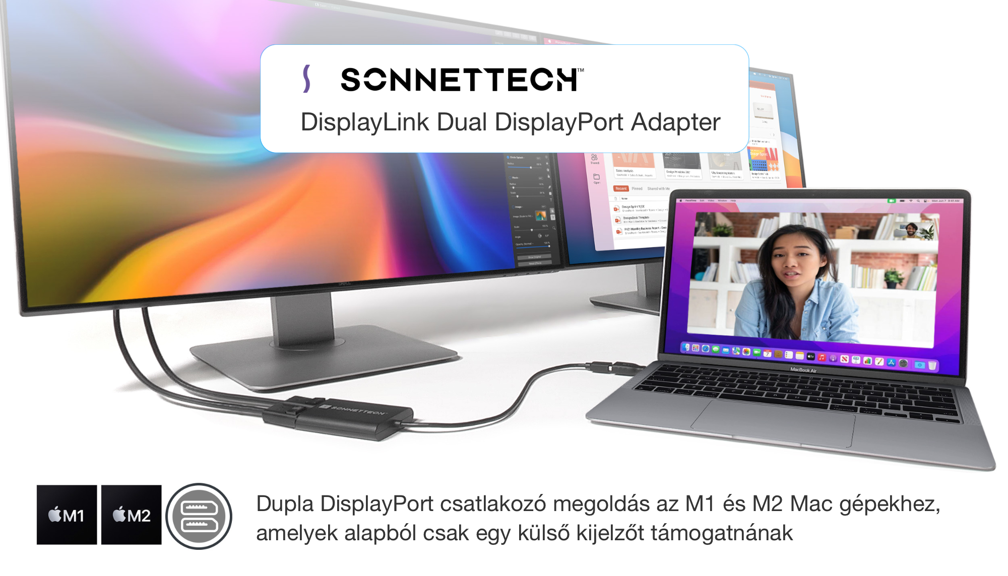 A Sonnet DisplayLink Dual DisplayPort Adapter for M1 and M2 Macs termék egyetlen USB-C (vagy akár USB-A) kapuról képes kettő darab DisplayPort csatlakozós kijelzőt meghajtani akár 3840 x 2160 (4K, 2160p) felbontásban 60 Herz képfrissítés mellett, továbbá lefelé kompatibilis az 1440p és 1080p felbontások irányába akár 144 Herz frissítési rátával. Minderre azért képes, mert a MacBook Pro és MacBook Air M1 vagy M2 processzorai rendelkeznek akkora videó teljesítménnyel, hogy ezen képességekre lehetőséget kínálnak.