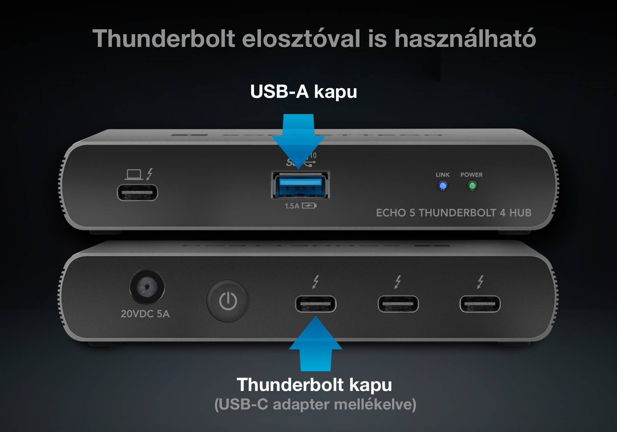 Mivel itt speciális USB 3 alapú szoftveres kerülőút működik, így a Sonnet DisplayLink Dual DisplayPort Adapter for M1 and M2 Macs termék USB-A kábelvéggel érkezik, amelyhez mellékelnek egy USB-C adaptert. Ennek köszönhetően a célzott gépek Thunderbolt 4 kapuira is tudjuk csatlakoztatni az adaptert a működéshez, de például a Sonnet Echo 5 Thunderbolt 4 Hub esetén akár a Thunderbolt kapuk valamelyikébe, akár az USB-A kapuba is csatlakoztathatjuk az adaptert, a működés ugyanúgy biztosított.